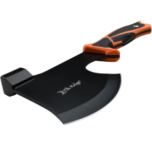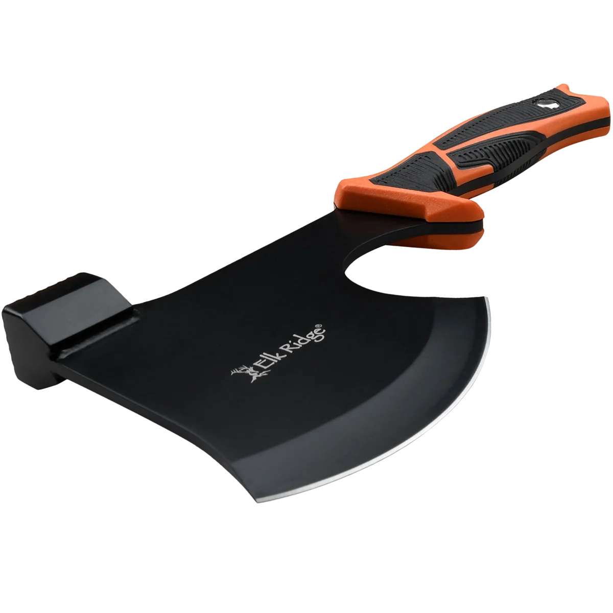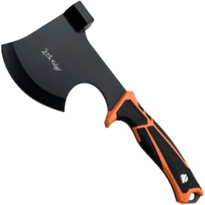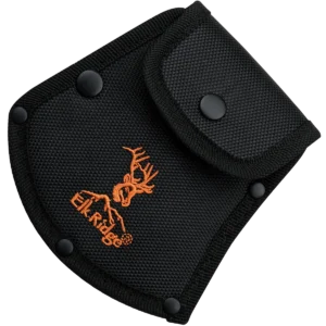 The Elk Ridge Trek camp axe features a black finish 3Cr13 stainless steel axe head with 3.5" cutting edge. 3Cr13 offers an excellent balance of hardness and corrosion resistance. Its black and orange rubberized ABS handle measures 5" and offers an ergonomic and comfortable grip, even in adverse conditions. The full, extended tang ends in a lanyard hole. Supplied with a black nylon belt sheath.