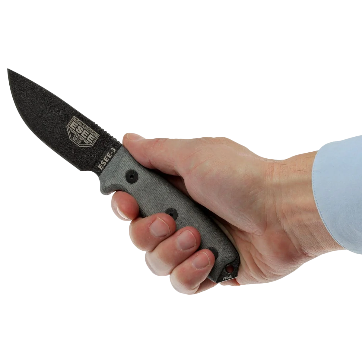 This is the model that started it all. After designing the RAT-3 for Ontario Knife Company, it was the first design they brought over when ESEE Knives (Formerly RAT Cutlery) was formed. These knives are made from high carbon 1095 steel. And while 1095 is a top choice for professional cutlery designed for hard use, it will rust and stain if not properly cared for – especially on the cutting edge and around the laser engraving. It is the user's responsibility to keep the blades properly lubricated and cleaned. The ESEE-3P-MB-B fixed blade knife features a black finished 1095 steel blade with a plain cutting edge, gray linen Micarta scales and a standard breaker pommel. The ESEE-3P-MB includes a black molded sheath, boot clip, paracord, cord lock and Cordura MOLLE back.