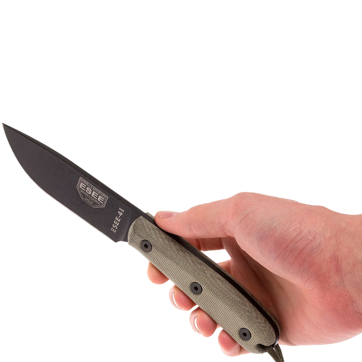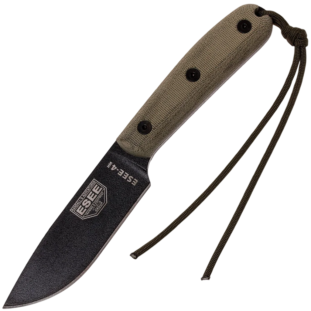 The ESEE-4 is one of the most popular ESEE knives ever made. With its 0.1875" blade thickness, it's the perfect blend between toughness and cutting efficiency all in a small package. If you can only choose one, then the ESEE-4 is the do-all workhorse of the ESEE line. These knives are made from high carbon 1095 steel. And while 1095 is a top choice for professional cutlery designed for hard use, it will rust and stain if not properly cared for – especially on the cutting edge and around the laser engraving. It is the user's responsibility to keep the blades properly lubricated and cleaned.