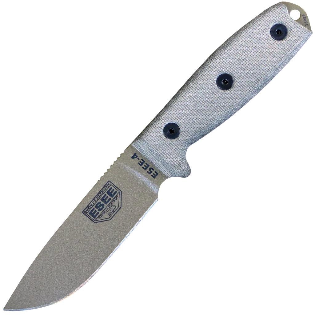 Since 1997 Randall's Adventure & Training has designed no-nonsense, affordable field knives specifically targeted to military, law enforcement, and the special operations community. Many of their knives now serve in "hot" zones around the globe. ESEE Knives is also setting the standard for many local, state and federal law enforcement officers when it comes to high performance, compact sheath knives with multiple carry options. The NTOA scored the 3-inch fixed blade a 4.77 out of a possible 5. In addition to knives, ESEE also offers survival, land navigation, tracking and other training courses along with free survival information. The ESEE-4 is one of the most popular ESEE knives ever made. With its 0.1875" blade thickness, it's the perfect blend between toughness and cutting efficiency all in a small package. If you can only choose one, then the ESEE-4 is the do-all workhorse of the ESEE line. These knives are made from high carbon 1095 steel. And while 1095 is a top choice for professional cutlery designed for hard use, it will rust and stain if not properly cared for – especially on the cutting edge and around the laser engraving. It is the user's responsibility to keep the blades properly lubricated and cleaned. ESEE-4s are shipped with a sheath instruction sheet and Survival Business Card.
