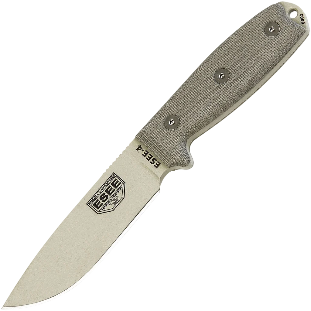 Since 1997 Randall's Adventure & Training has designed no-nonsense, affordable field knives specifically targeted to military, law enforcement, and the special operations community. Many of their knives now serve in "hot" zones around the globe. The knives have a "no questions asked" lifetime warranty. ESEE Knives is also setting the standard for many local, state and federal law enforcement officers when it comes to high performance, compact sheath knives with multiple carry options. The NTOA scored the 3-inch fixed blade a 4.77 out of a possible 5. In addition to knives, ESEE also offers survival, land navigation, tracking and other training courses along with free survival information. The ESEE-4 is one of the most popular ESEE knives ever made. With its 0.1875" blade thickness, it's the perfect blend between toughness and cutting efficiency all in a small package. If you can only choose one, then the ESEE-4 is the do-all workhorse of the ESEE line. These knives are made from high carbon 1095 steel. And while 1095 is a top choice for professional cutlery designed for hard use, it will rust and stain if not properly cared for – especially on the cutting edge and around the laser engraving. It is the user's responsibility to keep the blades properly lubricated and cleaned. ESEE-4s are shipped with a sheath instruction sheet and Survival Business Card.