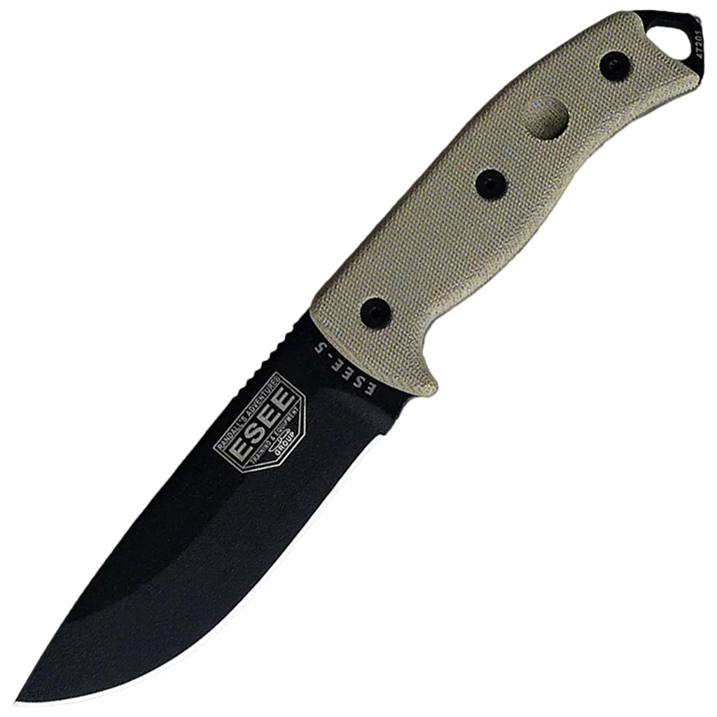 Since 1997 Randall's Adventure & Training has designed no-nonsense, affordable field knives specifically targeted to military, law enforcement, and the special operations community. Many of their knives now serve in "hot" zones around the globe. The knives have a "no questions asked" lifetime warranty. ESEE Knives is also setting the standard for many local, state and federal law enforcement officers when it comes to high performance, compact sheath knives with multiple carry options. In addition to knives, ESEE also offers survival, land navigation, tracking and other training courses along with free survival information. The ESEE-5 was designed by military SERE instructors as a hard-use downed pilot’s survival knife. With its 0.25" blade thickness, it's a big fixed blade that's tough, durable and practical. These knives are made from high carbon 1095 steel. And while 1095 is a top choice for professional cutlery designed for hard use, it will rust and stain if not properly cared for – especially on the cutting edge and around the laser engraving. It is the user's responsibility to keep the blades properly lubricated and cleaned. The handles have Micarta scales that are durable and water resistant. The knife also features spine jimping, full tang construction, lanyard hole, and a glass breaker. The knife comes with a Kydex sheath, clip plate, paracord lanyard, and cord lock.
