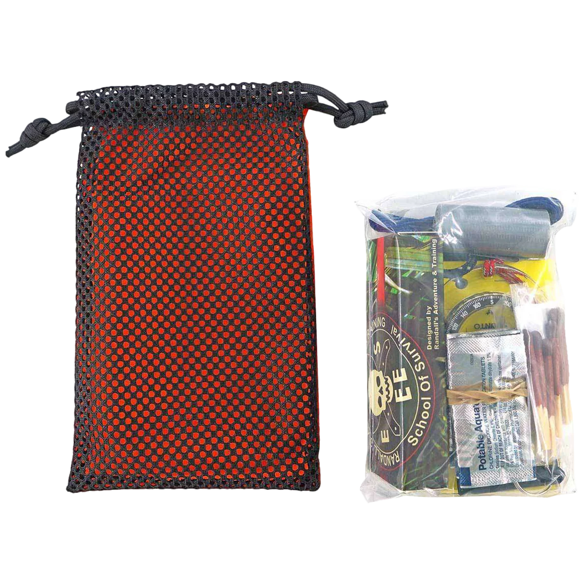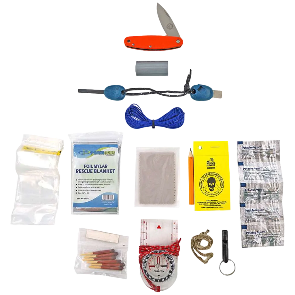 This compact survival kit from ESEE Knives covers all the essentials to get you through a wilderness emergency. Navigation, shelter, water, signaling, cutting tool,and fire in one small kit you can stash just about anywhere. The kit comes in a high visibility orange/mesh bag that will fit your cargo pocket, glove compartment, backpack, etc. Contents: Duct tape Mylar blanket Signal mirror Cordage Any Weather Paper Notebook Compass Waterproof matches Fire steel and striker Fibrous Tinder Water purification tablets ESEE Churp Linerlock Folding Knife Whistle Pencil