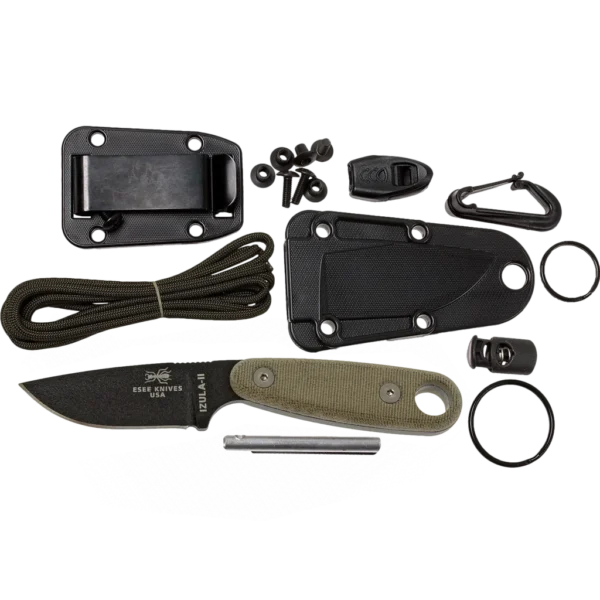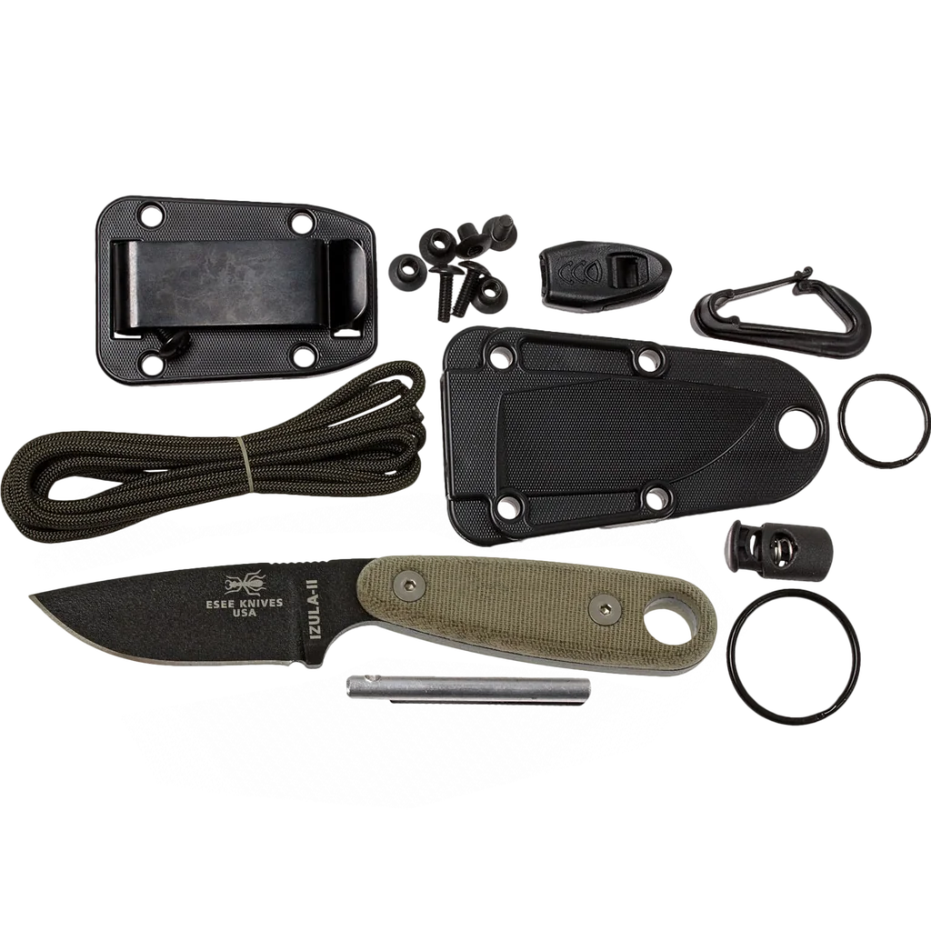 The locals in Peru call the meanest, nastiest ant of the jungle by the name "Isula" and we know it as the Bullet Ant. The Bullet Ant is known to be independent, tough, light on its feet, and a real aggressive survivor. The Izula knife is built the same way and designed to be the perfect lightweight survival tool. The Izula-II is the same as the standard Izula except it has a half-inch of length added to the handle and includes full Micarta handle scales. These knives are made from high carbon 1095 steel. And while 1095 is a top choice for professional cutlery designed for hard use, it will rust and stain if not properly cared for – especially on the cutting edge and around the laser engraving. It is the user's responsibility to keep the blades properly lubricated and cleaned. We suggest using a dry film rust inhibitor such as TUF-GLIDE or TUF-CLOTH. Izula Complete Survival Kit includes paracord, cord lock, large split ring, small split ring, ferro fire starting rod, emergency whistle, and plastic snap hook.