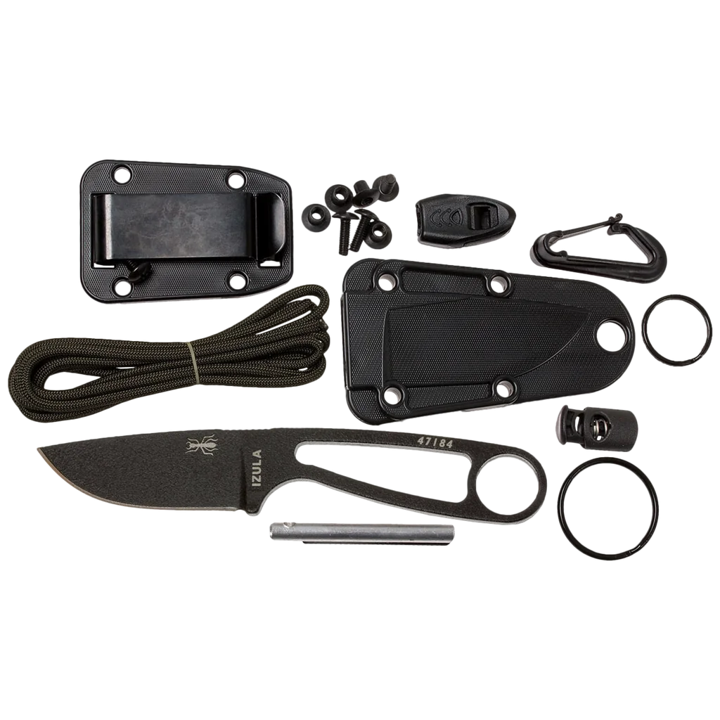 Since 1997 Randall's Adventure & Training has designed no-nonsense, affordable field knives specifically targeted to military, law enforcement, and the special operations community. Many of their knives now serve in "hot" zones around the globe. The knives have a "no questions asked" lifetime warranty. ESEE Knives is also setting the standard for many local, state and federal law enforcement officers when it comes to high performance, compact sheath knives with multiple carry options. ESEE also offers survival, land navigation, tracking and other training courses along with free survival information. The locals in Peru call the meanest, nastiest ant of the jungle by the name "Isula" and we know it as the Bullet Ant. The Bullet Ant is known to be independent, tough, light on its feet, and a real aggressive survivor. The Izula knife is built the same way and designed to be the perfect lightweight survival tool. These knives are made from high carbon 1095 steel. And while 1095 is a top choice for professional cutlery designed for hard use, it will rust and stain if not properly cared for – especially on the cutting edge and around the laser engraving. It is the user's responsibility to keep the blades properly lubricated and cleaned. We suggest using a dry film rust inhibitor such as TUF-GLIDE or TUF-CLOTH. Izula Complete Survival Kit includes paracord, cord lock, large split ring, small split ring, ferro fire starting rod, emergency whistle, and plastic snap hook.
