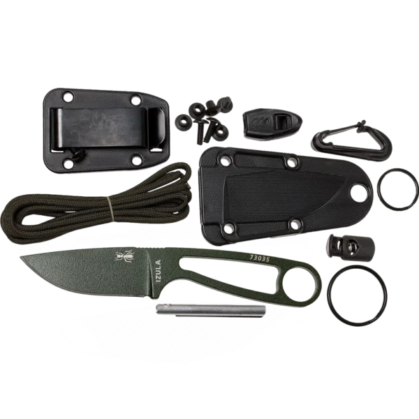 Since 1997 Randall's Adventure & Training has designed no-nonsense, affordable field knives specifically targeted to military, law enforcement, and the special operations community. Many of their knives now serve in "hot" zones around the globe. The knives have a "no questions asked" lifetime warranty. ESEE Knives is also setting the standard for many local, state and federal law enforcement officers when it comes to high performance, compact sheath knives with multiple carry options. ESEE also offers survival, land navigation, tracking and other training courses along with free survival information. The locals in Peru call the meanest, nastiest ant of the jungle by the name "Isula" and we know it as the Bullet Ant. The Bullet Ant is known to be independent, tough, light on its feet, and a real aggressive survivor. The Izula knife is built the same way and designed to be the perfect lightweight survival tool. These knives are made from high carbon 1095 steel. And while 1095 is a top choice for professional cutlery designed for hard use, it will rust and stain if not properly cared for – especially on the cutting edge and around the laser engraving. It is the user's responsibility to keep the blades properly lubricated and cleaned. We suggest using a dry film rust inhibitor such as TUF-GLIDE or TUF-CLOTH. Izula Complete Survival Kit includes paracord, cord lock, large split ring, small split ring, ferro fire starting rod, emergency whistle, and plastic snap hook.