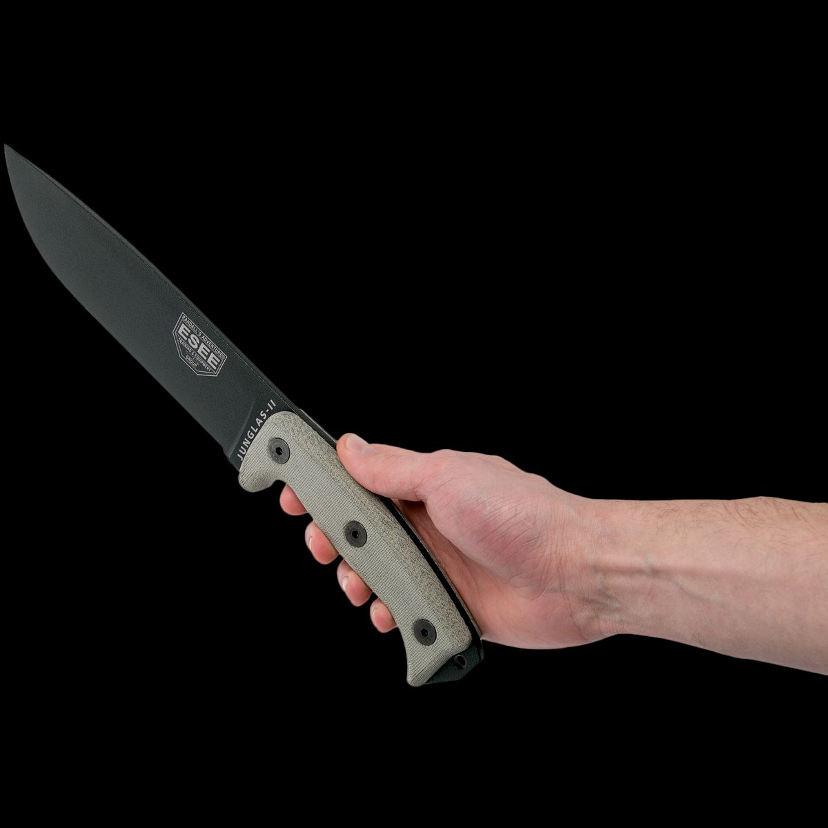 Introducing the Junglas-II, same as the original Junglas but now in a more compact version that's two inches shorter than the original. The Junglas is named after the Colombian police “JUNGLA” Compañía Jungla Antinarcóticos special operations forces and was originally designed as a cross between a fixed blade knife and a machete to be employed in Latin American jungle and counter-narcotics operations. The original Junglas now sees service with counter-narcotics operators, adventurers, and woodsmen globally but is still a behemoth with a 10.375" blade. This more compact model, like the ESEE-6, is a great all-around tool that blends survival, hunting, camping, and tactical applications perfectly into one great looking package. These knives are made from high carbon 1095 steel. And while 1095 is a top choice for professional cutlery designed for hard use, it will rust and stain if not properly cared for – especially on the cutting edge and around the laser engraving. It is the user's responsibility to keep the blades properly lubricated and cleaned. We suggest using a dry film rust inhibitor such as TUF-GLIDE or TUF-CLOTH.