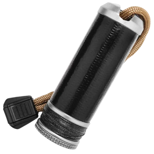 ripSPOOL™ is a field gear repair kit that can also be used as an improvised fishing kit. It includes 60 feet of 30lb test braided sythetic line, 50 inches of heavy-duty repair tape, a #16 sail needle and a lanyard with a flammable internal core for emergency fire starting (Firecord).