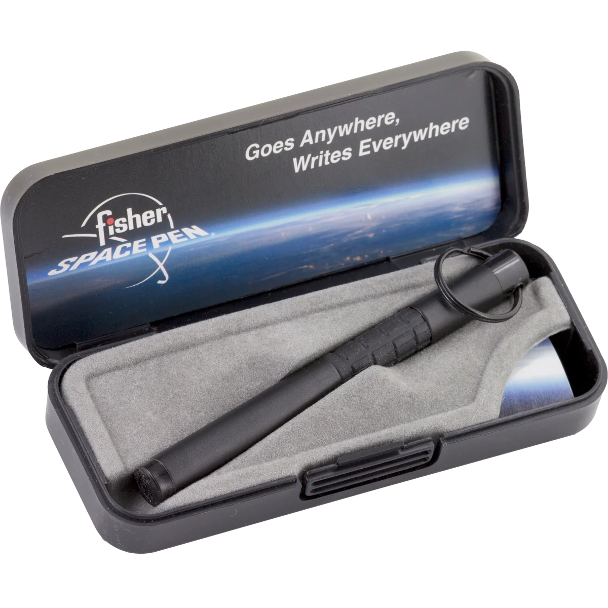 Description Style: Snap Off Cap Length: 3.875" .375" diameter Cartridge: Fisher PR4 Pressurized Refill. Black Ink Medium Point Composition: Matte Black with Fisher Rubber Comfort Grip™ Packaging: Gift Box Pioneering in technology, the trekker Space Pen can hang upside down forever, yet function immediately when needed. This pen is "the Bomb" for so many different folks. Are you an executive? Put it on your keychain and always have a quality writing instrument at hand. Police/Fire/Ambulance…clip it to your belt and it will sail through the daily abuse it will get! Students love this on their school lanyard. It's the choice of mountain climbers, sojourners, farmers, and security guards. Give this pen as a gift and you'll be remembered forever. The trekker Space Pen with a key chain ring attached to the posi-lock cap allows for easy accessibility. The trekker Space Pen comes with a carabiner and a break-away lanyard, making it easily attachable to a belt loop, back pack, purse, climbing gear, briefcase, or anything else that is within your reach.