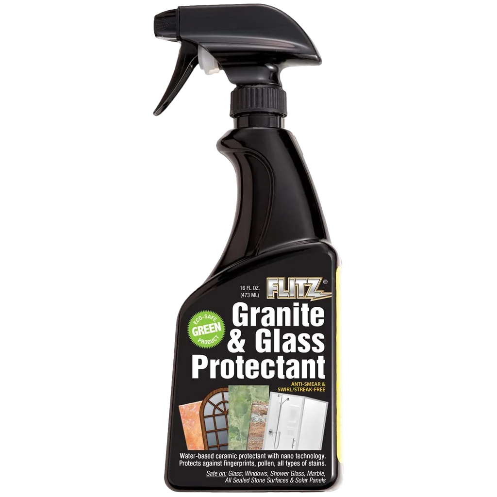 Description: (473ml) Seal and protect against the damage caused by hard water & mineral deposits, wine, food, makeup, hair spray and more. An engineered ceramic coating. Quick & easy. Just spray & wipe. STREAK FREE GRANITE PROTECTANT: Polish and seal your kitchen and bathroom countertop surfaces. Leaves a brilliant mirror like shine with no residue or haze left behind. Proprietary sealant formula makes surfaces easier to clean and protects against staining. EASILY REMOVES: Hard water and mineral deposits, wine and food stains, oil, coffee, grease, hairspray, makeup, and much more. Simple to use, just spray on and wipe off. LETS the natural beauty of your surfaces shine through, while keeping them clean and protected. SAFE ON FOOD SURFACES: Non-toxic, non-acidic and non-flammable. Contains no phosphates or ammonia. Safe to use on food preparation surfaces in the kitchen. You've spent a fortune for those countertops! Seal and protect them against hard water & mineral deposits, wine, food, makeup, hair spray and more with this hydrophobic nano-ceramic coating. Keep them cleaner longer! Quick & easy! Just spray & wipe. Safe for use on: Granite, Marble, Corian®, Formica® Wilsonart®, Nevamar®, Avonite® Swanstone®, Silestone®, Ceramic tile Plexiglass, Acrylics, Plastics All metals and glass Porcelain, Enamel Living Finishes Oil-Rubbed Bronze Not for floors: May cause slip-hazard if product or overspray comes in contact with floors. 1. Shake well 2. Spray (Do Not Let Dry) 3. Buff with Flitz Microfiber Cloth