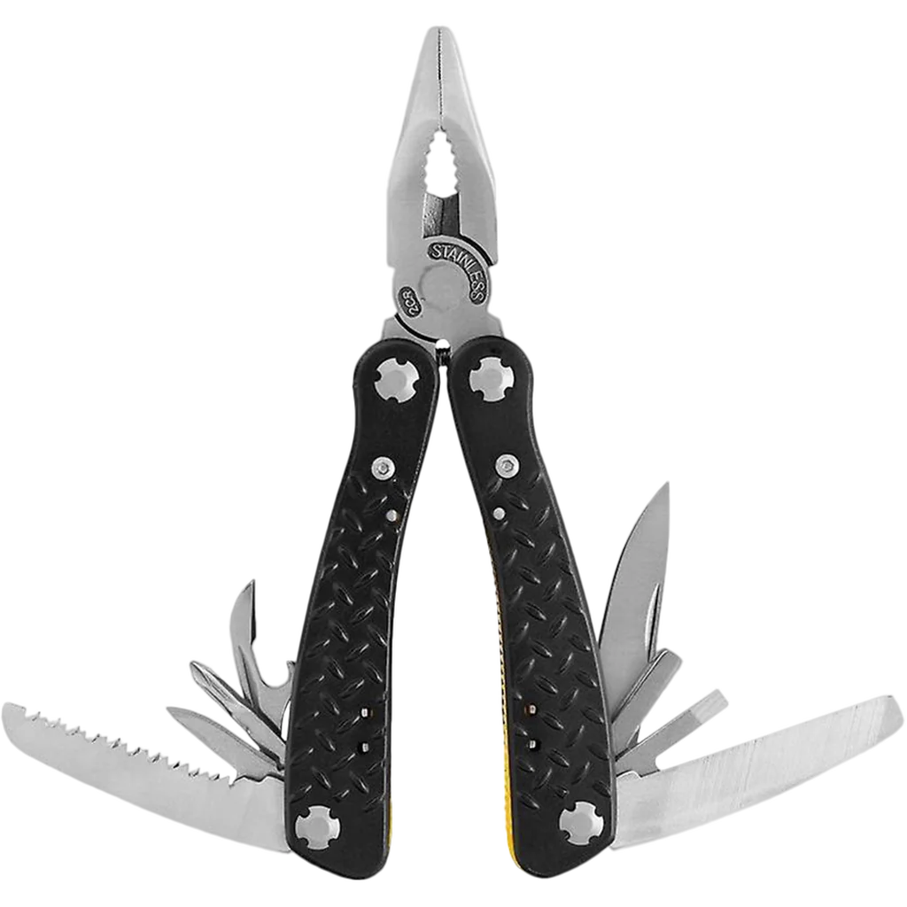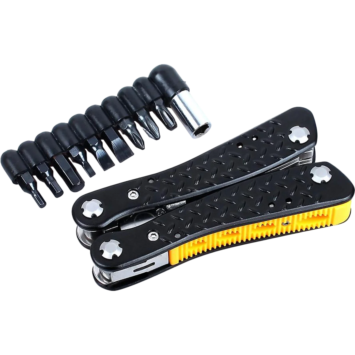 The Ganzo G106 multitool is the latest offering from Ganzo for a handy EDC tool set. The G106 has everything necessary for last minute renovation, repairs, installation and unexpected breakdowns. The perfect companion on the worksite, the home or the outdoors. The handle is made of durable aluminum, and the blades are made of stainless steel. A secure grip is possible thanks to the notched edges and the ergonomically shaped handle. The set includes 9 bits and a functional cover that can be attached to the belt. Built-in tools: 3 hexagon bits, 3 cross bits 3 flat bits, bit base, standard pliers, narrow flat screwdriver, serrated blade, smooth blade, wire cutter, a bottle opener, can opener, file, awl, cross screwdriver.