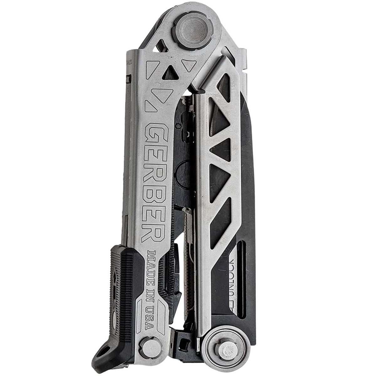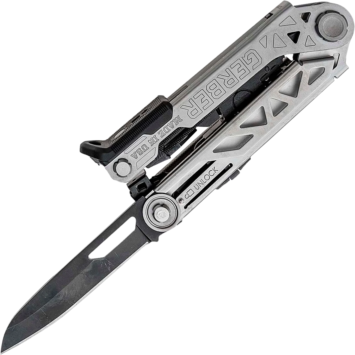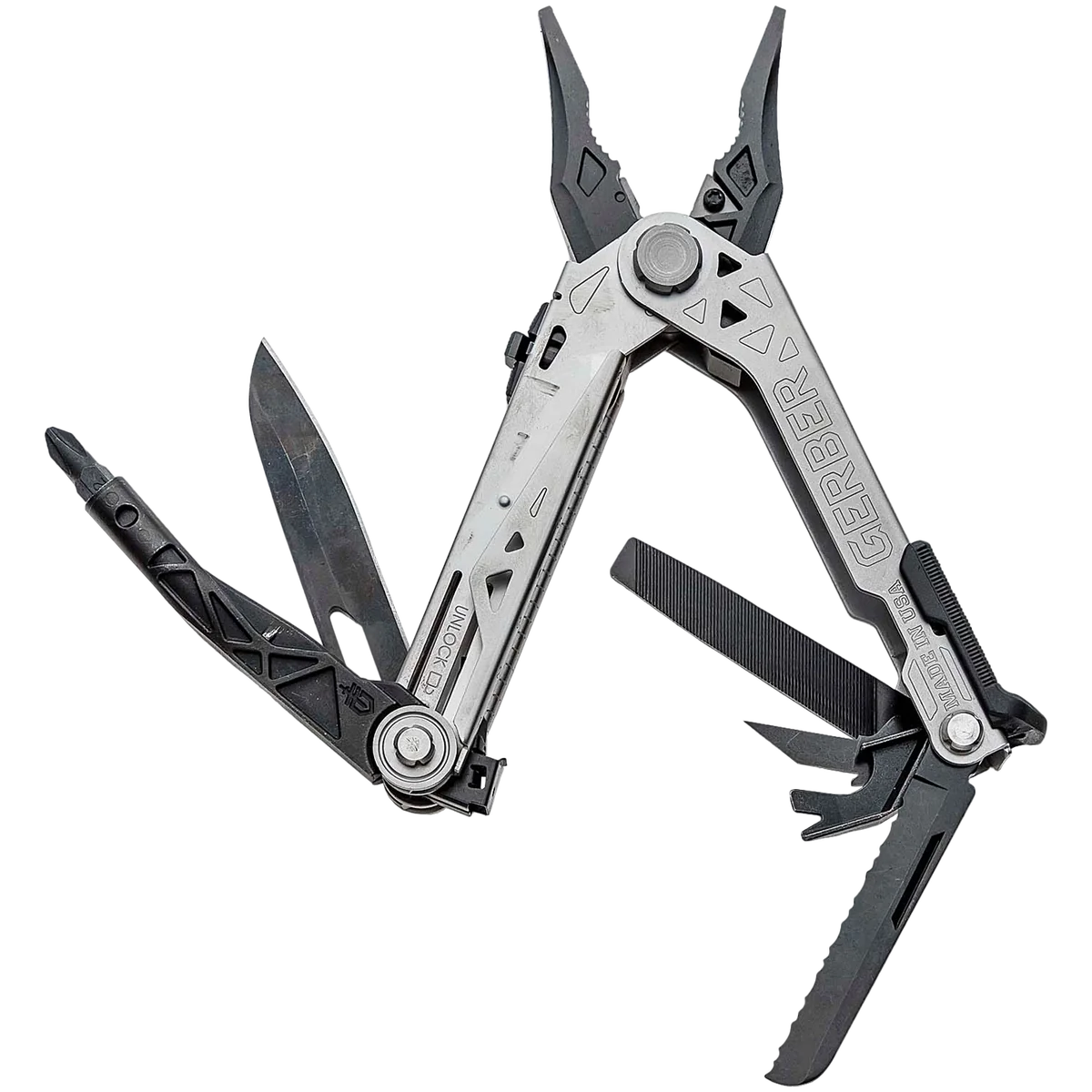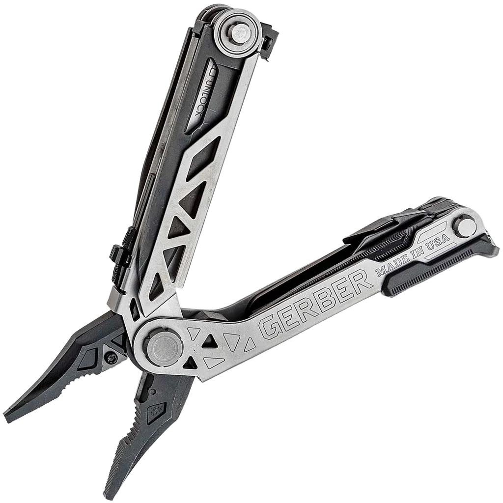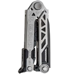 Gerber's new multi-tool offers uncompromising performance through revolutionary design. The innovative centre-axis driver opens to align like a real screw driver, yielding maximum torque and rotation. No productivity is sacrificed with the addition of a 30% longer outboard blade and one-thumb opening sliding jaws. Features: – One-Handed Opening System – Spring-Loaded Pliers – Centre-Axis Driver – Rotatable Carbide Cutter & Strippers – Pry Bar & Bottle Opener – Fine Edge Blade – Ruler – Serrated Saw – Double-Sided File – Awl – Lanyard Hole – Onboard Storage for ¼” Bit – Includes a Nylon Sheath – Includes a Bit Set