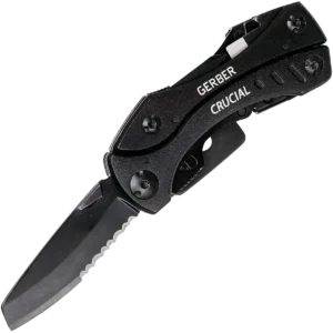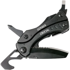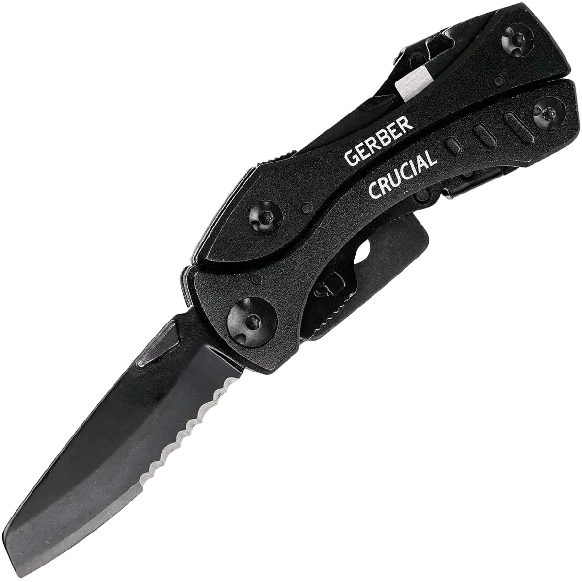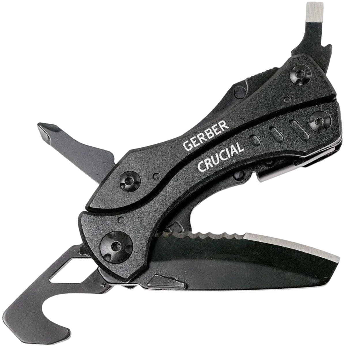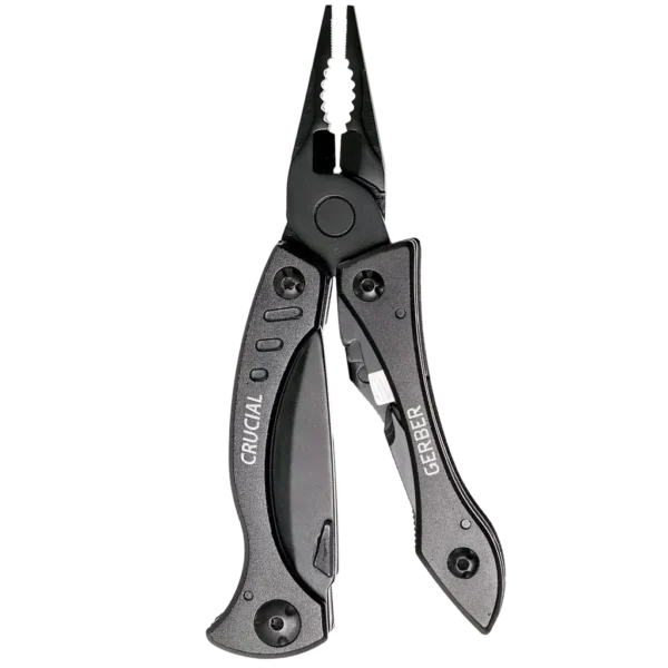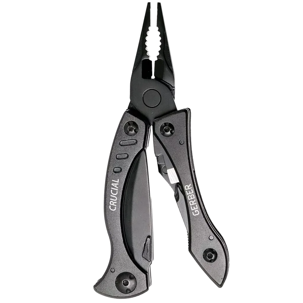 The Crucial is a mid-sized multi-tool fitted with a set of needle nose pliers and a semi-serrated blade as its central appliances, as well as a variety of other essential tools conveniently located within its handles. The Crucial offers users an alternative body design to most other multi-tools, making it more ergonomic and fashionable through its use of curves and grips. The Crucial multi-tool is constructed of stain & corrosion resistant stainless steel, making it highly practical and reliable. The Crucial is simple to store, with implements that safely fold into the handles, significantly reducing size allowing for easier transport, and utilise a secure liner lock mechanism.