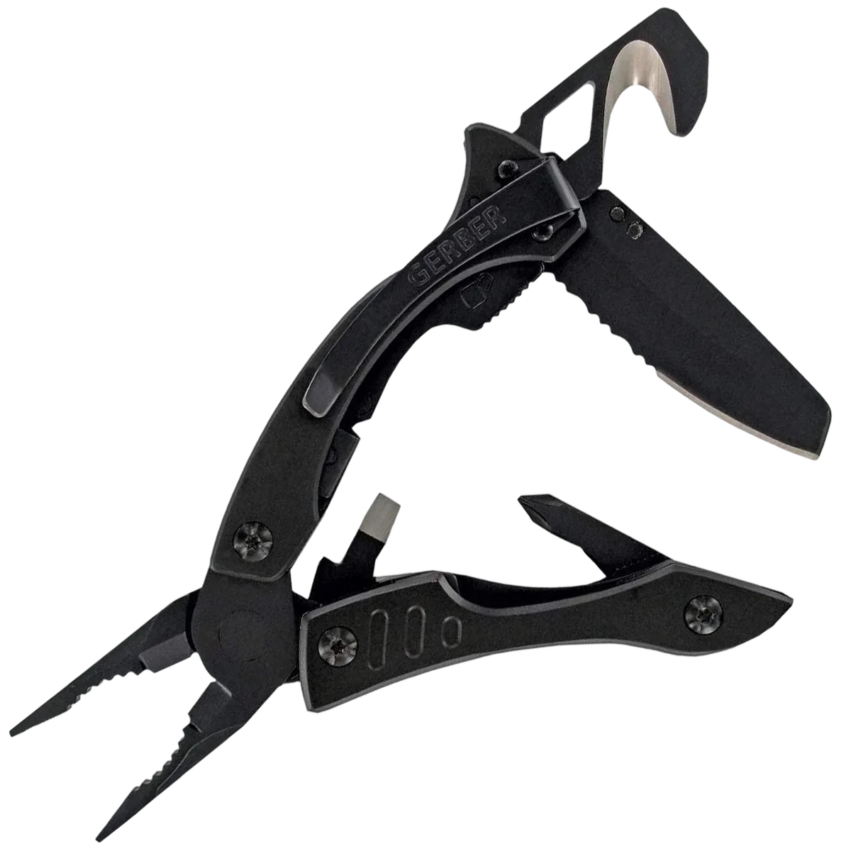 - Needle nose pliers, Carabiner clip, Regular pliers, Partially serrated blade with thumbstud, V-cut wire cutters, Bottle opener, Flat head screw driver, Phillips driver