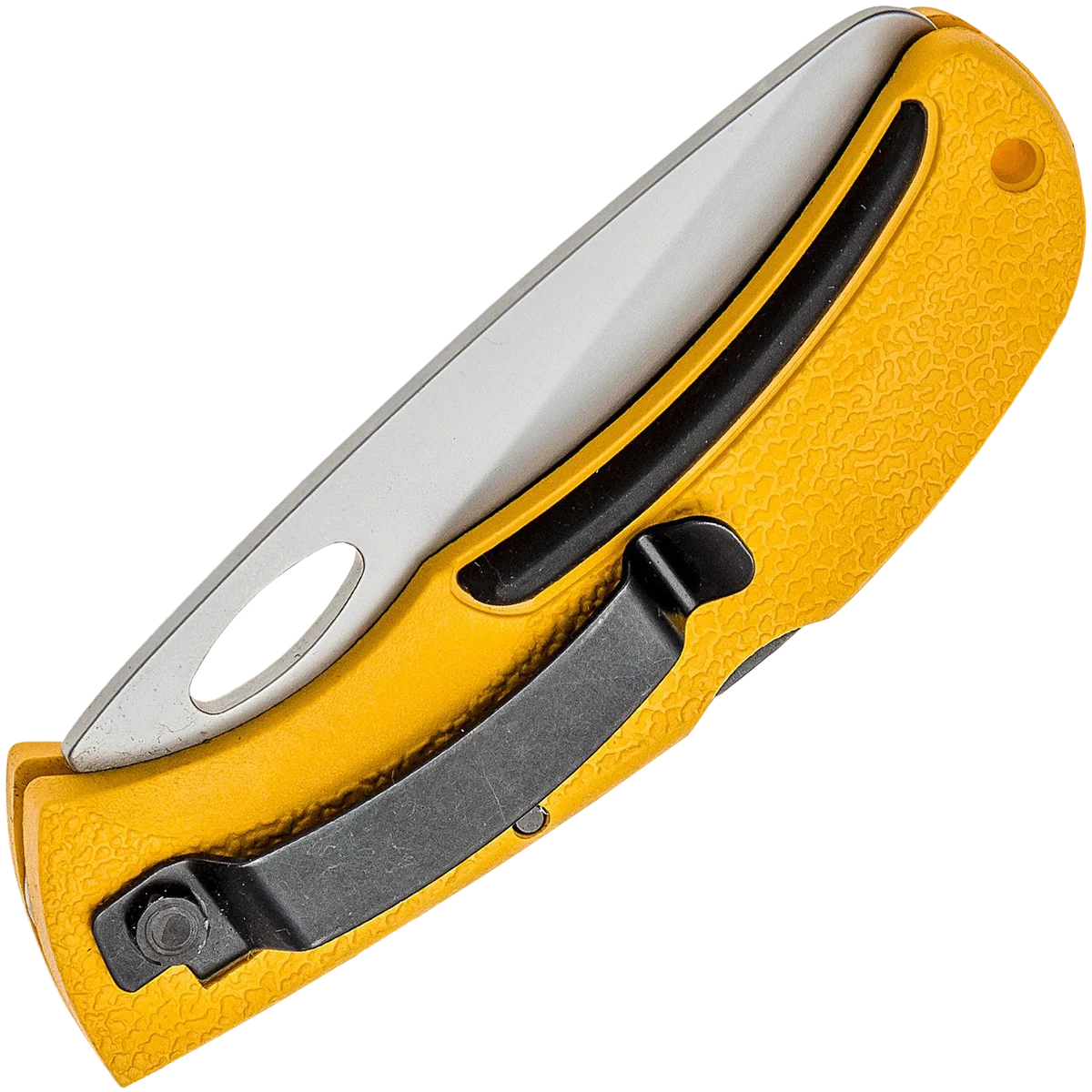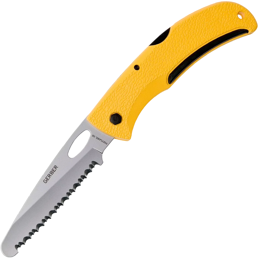 The E-Z Out Rescue is a specialist knife designed for cutting without risk of poking or puncturing an adjacent surface. Consisting of a stainless steel serrated blade with a blunt tip, and a safety yellow handle constructed of glass-filled nylon with softgrip inserts. The softgrip handle is made from Kraton, which improves grip. Designed for one-hand opening with a conveniently placed thumb hole for ambidextrous use, and a lock-back mechanism for securing the blade in place.
