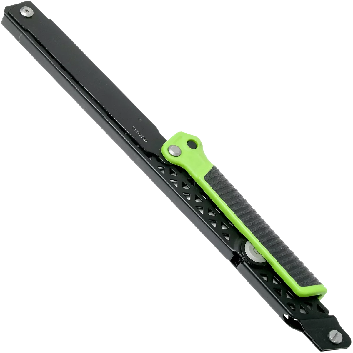The Freescape Camp Saw features an innovative design that allows the saw to fold up flat while remaining completely assembled and without threat of lost parts. It utilizes four pivot points to effectively cut larger diameter wood while using the full length of the blade. When folded up, the blade is protected and can be stowed safely in a gear kit or camp bin. The Freescape Camp Saw has bright green accents along its black rubber surface making it easy to spot in the shuffle of camp gear. The grippy rubberized textured handle stays firmly in the hand no matter what the conditions. The saws standard 12" blade can be easily replaced when required. Specifications: Open Dimensions: 373x167x28mm Closed Dimensions: 350x45x28mm Handle Material: Glass-filled nylon with overmold Frame: 2CR13 Steel