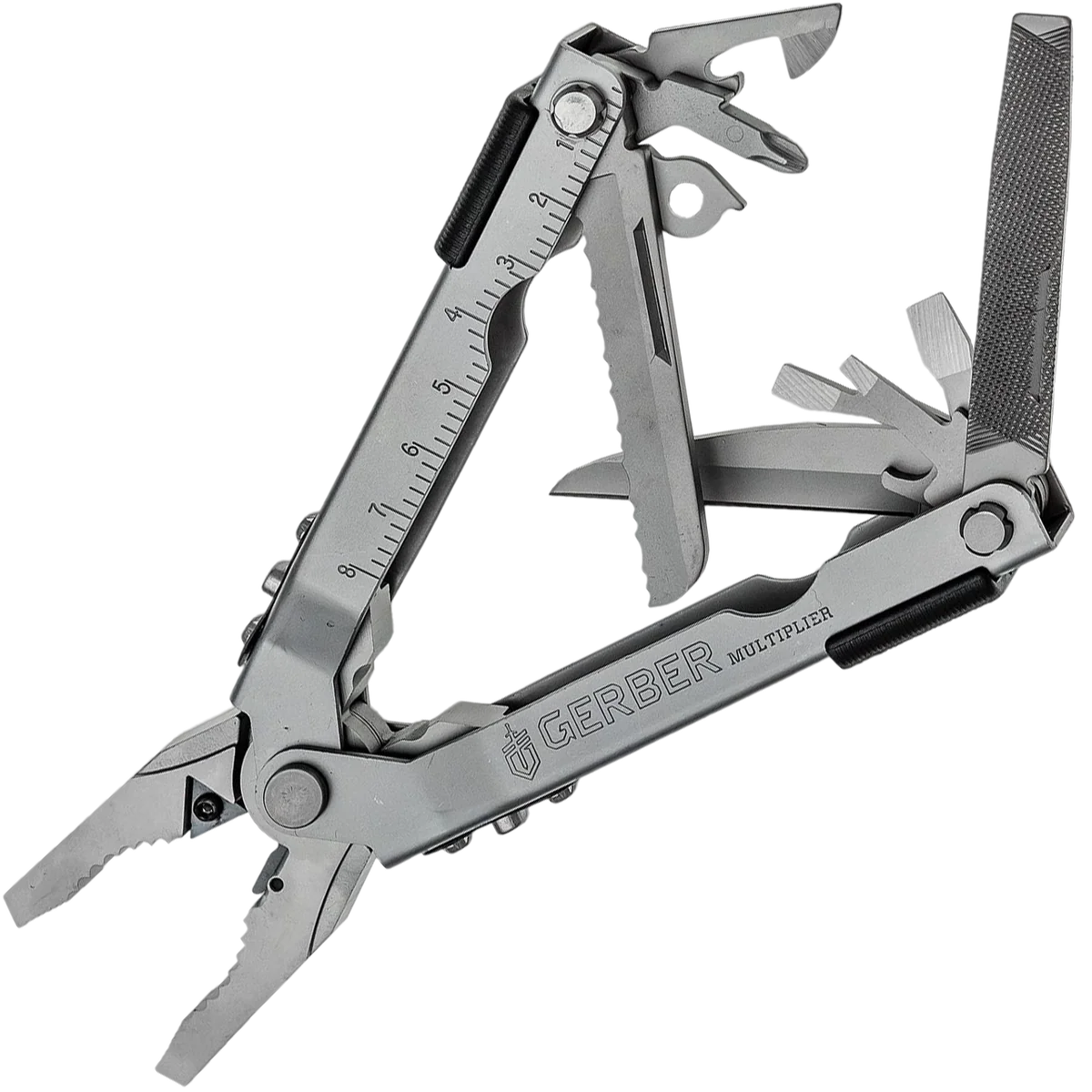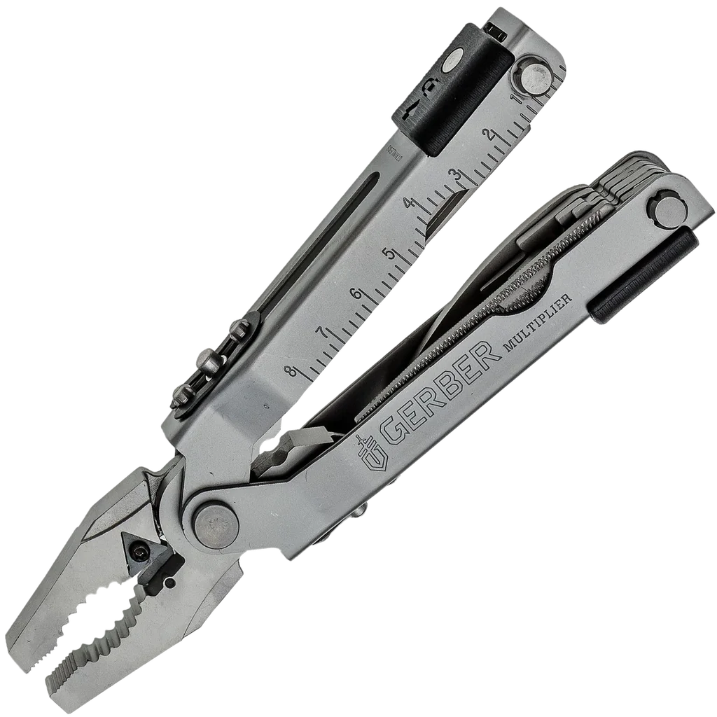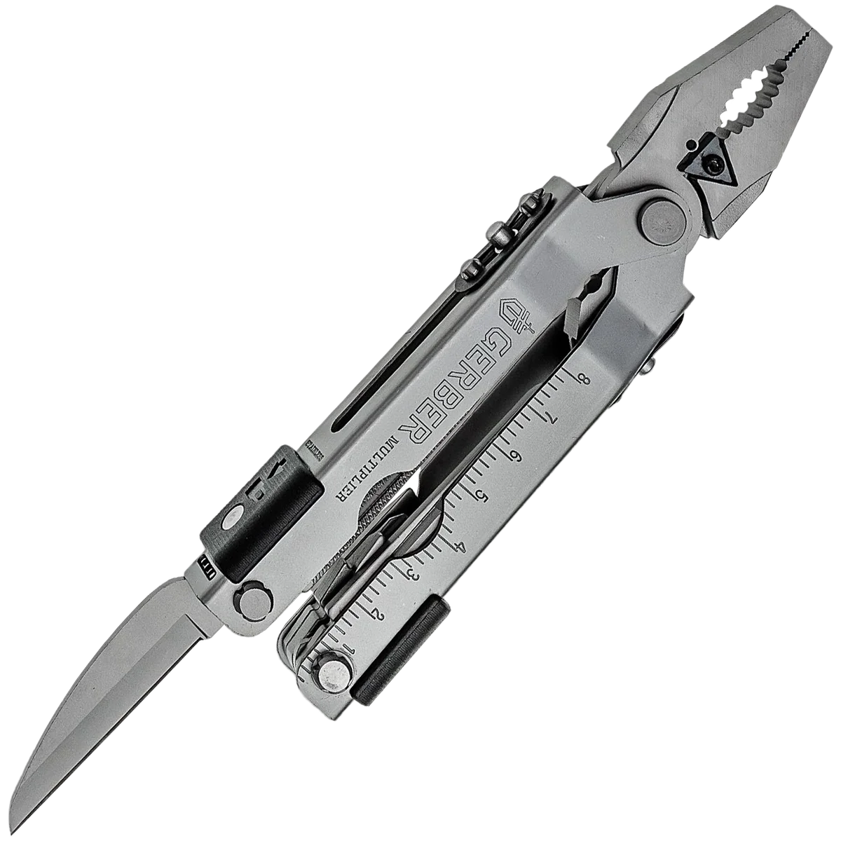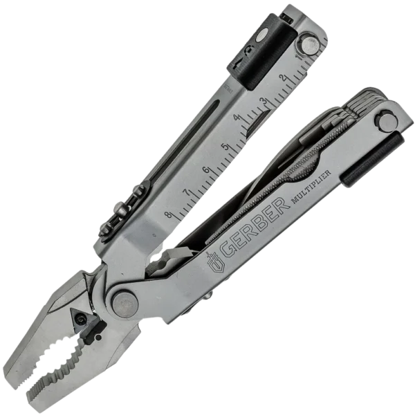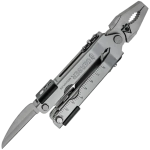 - Bluntnose pliers, Tungsten carbide insert cutters, wire crimper, fine edge knife, serrated knife, cross point screwdriver, small, medium and large flat blade screwdriver, lanyard ring, can opener & bottle opener, file, ruler