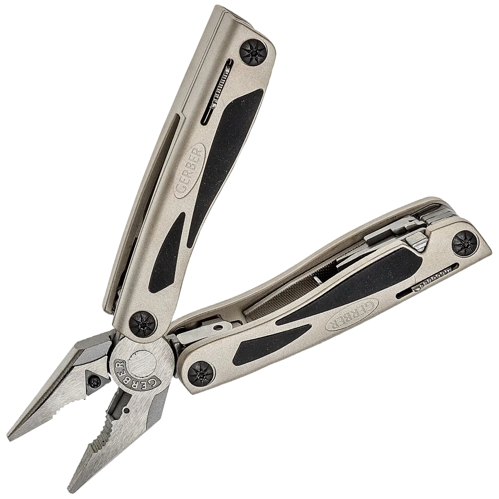 - Needle-nose pliers with replaceable carbide cutters, Fine edge knife, Fiskars scissors, Cross point screwdriver, Small, medium and large flat blade screwdrivers, Bottle opener, File, Contoured aluminium handles, Tungsten carbide wire cutters