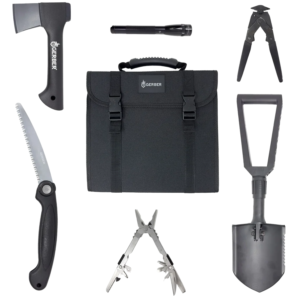 This survival kit equips its user with emergency tools. To be kept in your vehicle, this compact kit can be easily accessed. Measuring only 12-inches-by-11-inches-by-3-inches, the kit contains five high-quality tools indispensable for emergency situations including, a Gerber folding spade for digging, a back pack hand axe for chopping, an MP600 multi-plier for on-the-spot repairs, an exchange-a-blade sport saw for cutting thick branches and foliage, and a Maglite flashlight for after-dark visibility. Features: – MP 600 Multi-Plier – Exchange-a-Blade Hand Saw – Maglite Pro + Flashlight – Concertina Cutter – Back Pack Axe, E-Tool – First Aid Kit
