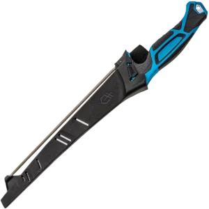 The Controller 10" Saltwater Fillet Knife is designed for clean, smooth cuts with a flexible blade that provides just the right amount of give. The intuitive GuideFins & tactile HydroTread Grip offer ultimate control of the knife, even in slippery conditions. Engineered to meet the needs of saltwater fisherman, SALT Rx offers superior protection against corrosion, wear, and tough environments. Selected specifically for its toughness, corrosion resistance, and edge retention, the 9Cr18MoV blade is also mirror polished for added protection and the ability to clean it easily. The Controller is constructed with a full tang steel blade for sturdy and safe use in slippery situations. A crucial part of the fillet knife system, is the Controller's innovative sheath. Designed with generous venting, the molded plastic sheath doesn't get water logged and is easy to rinse out when the job's done. A built-in sharpener allows for blade touch-ups on-the-go, and the sheath is easily mounted with multiple options for safe stowage on a backpack, belt, or pocket.