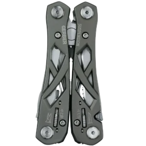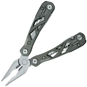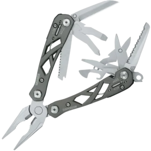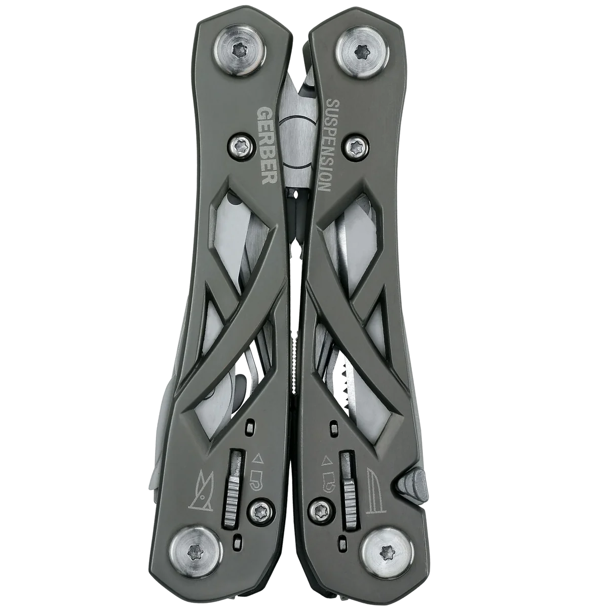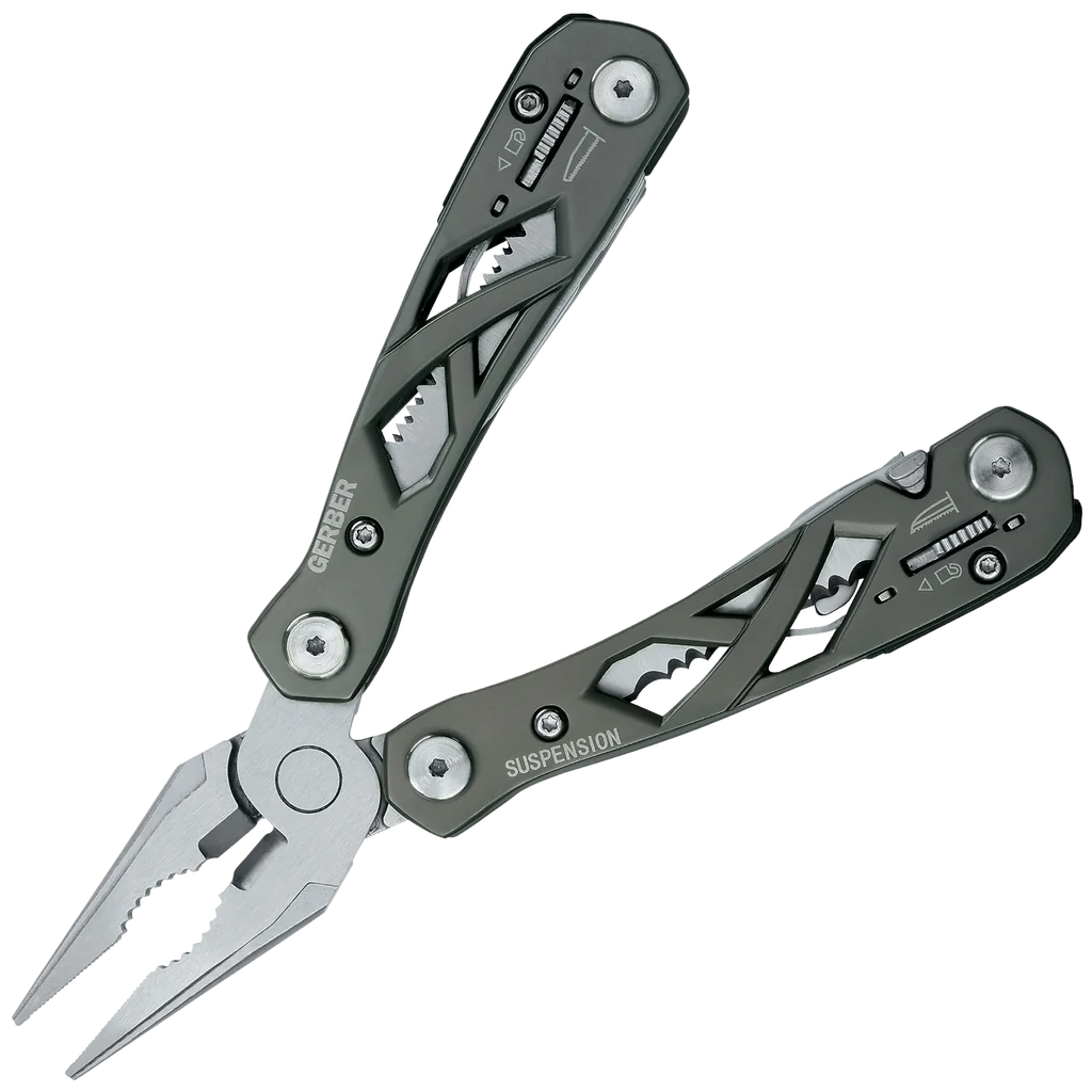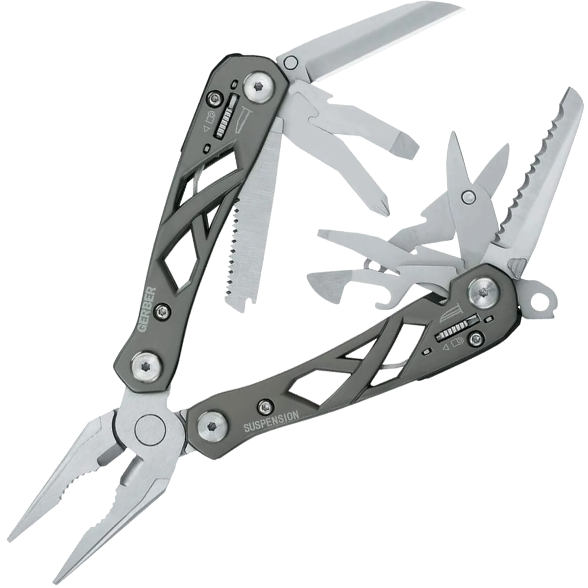 The Suspension is a mid-sized multi-tool fitted with a set of needle nose pliers as its central appliance, as well as a variety of other essential tools conveniently located within its handles. Tools can now be used without fear of unintentional movement due to the built-in Saf.T.Plus locking system. The handles offer a reduced body weight due to their para-frame design as well as an increased grip due to the resulting grooves. The Suspension multi-tool is constructed of stain & corrosion resistant stainless steel, making it highly practical and reliable. 12 Tools – Needlenose pliers (spring loaded) 'V-Cut' wire cutters Scissors Fine blade Serrated Saw Phillips screwdriver Small flat screwdriver Medium flat screwdriver Bottle opener Can opener Lanyard ring