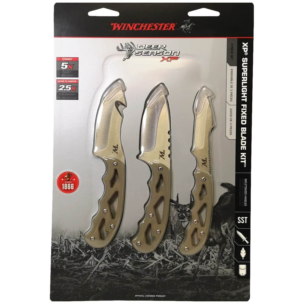 The XP Superlight 4-piece fixed blade kit benefits from a high comfort overmold design enclosing a lightweight skeletonised steel frame for prolonged use. Blades within this kit include a Gut Hook, enabling accelerated gutting and processing, a full tang utility fixed blade and caper. The knives are lightweight and feature high control jimping on the spine and have a large forward control choil, plus offer excellent corrosion resistance. The accompanying belt carry sheath has been designed to nest compactly within a pack worn on the hip. Caper Knife Blade Length: 2.7 inches Caper Knife Overall Length: 6.3 inches Utility Knife Blade Length: 2.3 inches Utility Knife Overall Length: 6.3 inches Gut Hook Knife Blade Length: 2.7 inches Gut Hook Knife Overall Length: 6.3 inches