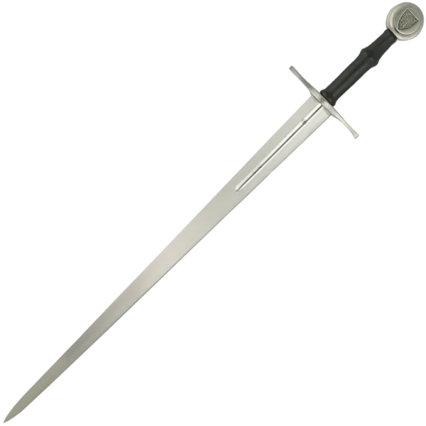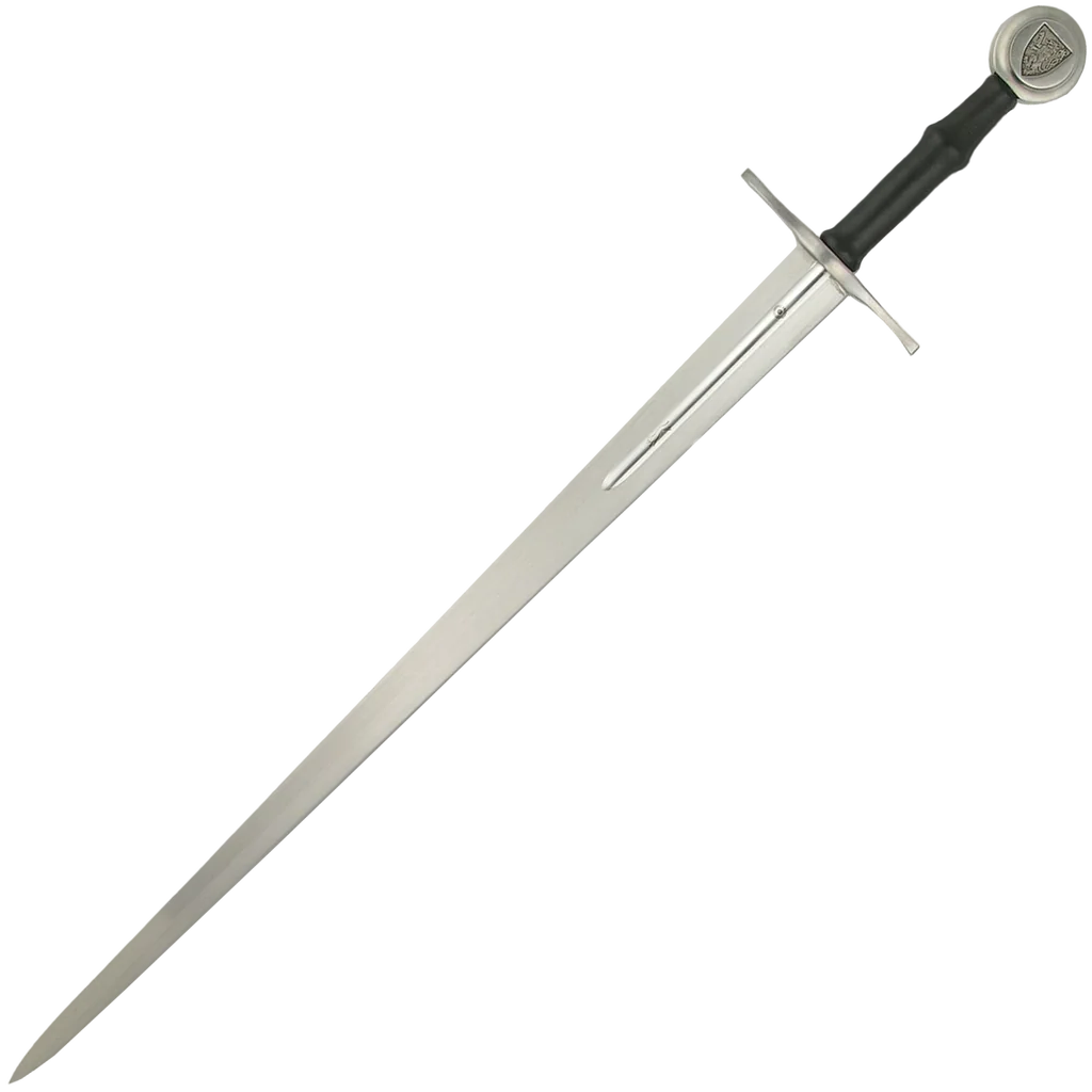 Replicated from a sword thought to be that of Albrecht II of Austria, the Paul Chen Hand-and-a-Half Sword represents the pinnacle of beauty and balance in medieval swords. Classically simple in design with a flattened diamond-section blade and cruciform hilt, the original dates from the early part of the 15th century. The Lion Rampant emblem of the Habsburg dynasty is engraved in the pommel, while the Passau Running Wolf guild mark and a marigold makers mark appear on the blade fuller. Both the grip and the scabbard are leather covered over wood. Features a 35" sharpened carbon steel blade.