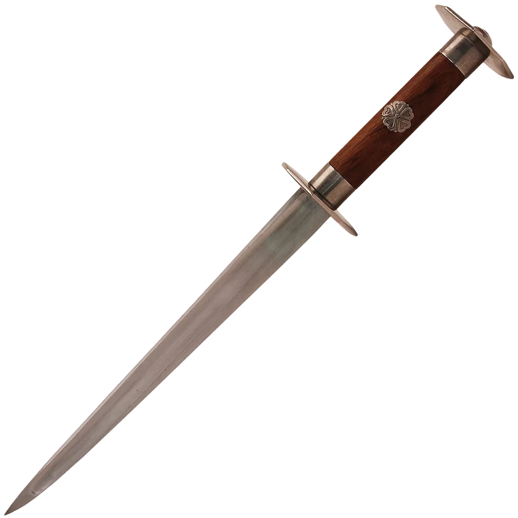 Introduced in response to many requests, the Hanwei Rondel Dagger is typical of the widely-used sidearm of the late middle ages. Carried by a wide section of the populace, from tradesmen to fully-armoured knights, the Rondel enjoyed a long service life. This version is both attractive and functional. The stiff T-section blade is edged and crafted in 5160 high-carbon steel, with a hardwood handle. All fittings, including the octagonal guard and pommel, are in steel and the leather-covered wooden sheath complements the dagger perfectly. The Rondel will appeal to collectors and living history participants alike.
