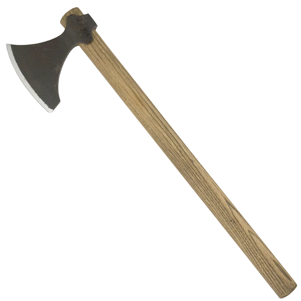 This fully functional authentic Short Axe from Hanwei features a forged head in blackened carbon steel, a sharp tempered edge and hardwood shaft; all given a beautiful antiqued finish. The axe shaft measures approximately 25" long and is tapered for a secure "slip head" fit. Featuring a forged head with hardened edge, the Hanwei short axe replicates tools of the era and is made to withstand throwing. It is well balanced and competition approved. Includes leather edge cover for safe handling and portability.
