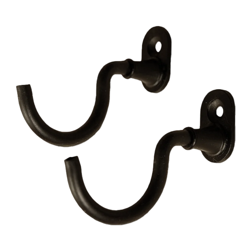 These steel katana hangers from Hanwei provide an economical and sturdy solution for displaying any Japanese-style sword on a wall. Supplied in pairs, with a black powder-coated finish, the hangers can be arranged to display the sword either horizontally or at an angle. They are supplied with mounting screws (wall board or sheet rock mounting will also require wall anchors). The hooks of the hangers are plastic-covered, to avoid damage to saya finishes. Simple and unobtrusive, these hangers are designed to focus attention on the sword being displayed.