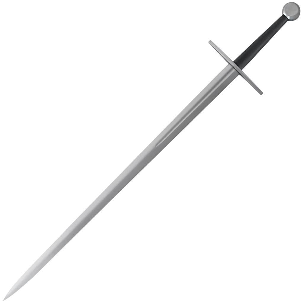 Michael 'Tinker' Pearce has designed a series of swords made by Hanwei in 5160 steel, which emphasise authenticity, functionality and performance. To satisfy the sparring and cutting needs of Western Martial Artists, each of the 7 styles are made in live (sharp) and sparring (blunt) versions and each sword has outstanding handling characteristics. The carefully controlled heat-treating of 5160 steel (Tinker's blade steel of choice) by the marquenching process produces an excellent combination of toughness and flexibility at a hardness of HRC 50-52, allowing for superior edge retention on the sharps, anti burr and tip-flexing safety features on the blunts. The Longswords, Bastard Swords and Early Medieval Swords all feature Tinker's recessed sleeve nut mounting system, providing secure hilt retention, tightening and easy blade exchange using the Allen wrench provided. The wheel-shaped pommel is sized to provide a grip for the second hand, and the straight tapering cross-section provides excellent hand protection. Leather covered scabbard is included.