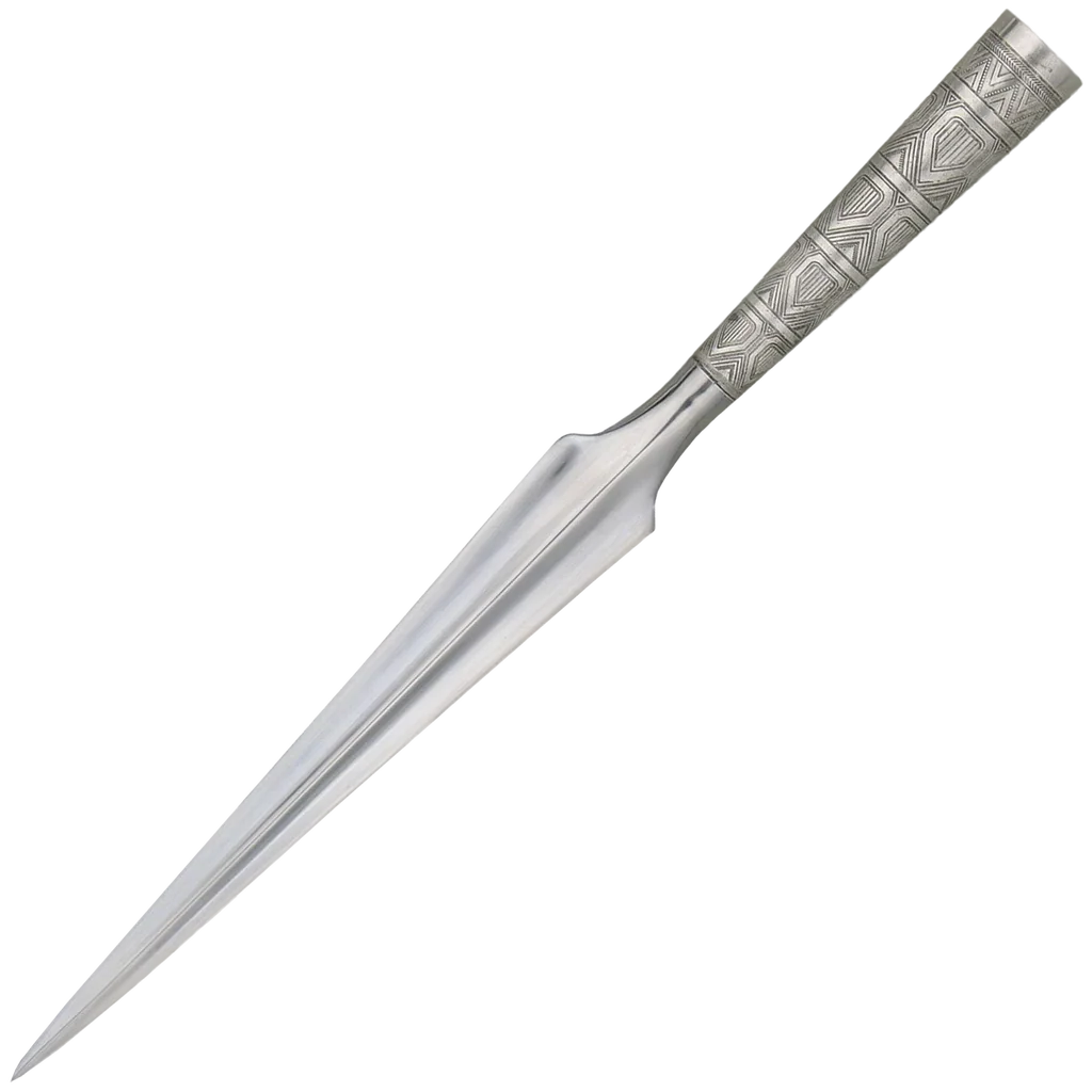 The decorated spearheads demonstrate the Viking’s creative use of intricate patterns, created using the “Niello” process. This involved using an alloy of several metals (notably silver) mixed with sulfur which was rubbed into an incised pattern and then fired. Where the alloy is rubbed into the engraving, it remains black while the rest of the surface is polished to a bright finish. Hanwei's decorating process provides a lustrous, permanent Niello-like effect. Each spearhead has a shaft diameter of 1”. Spearheads only are supplied. Note: This spear head is cast hollow, and therefore not suitable for functional use. It is ideal, however for re-enactment/living history costuming and displaying.