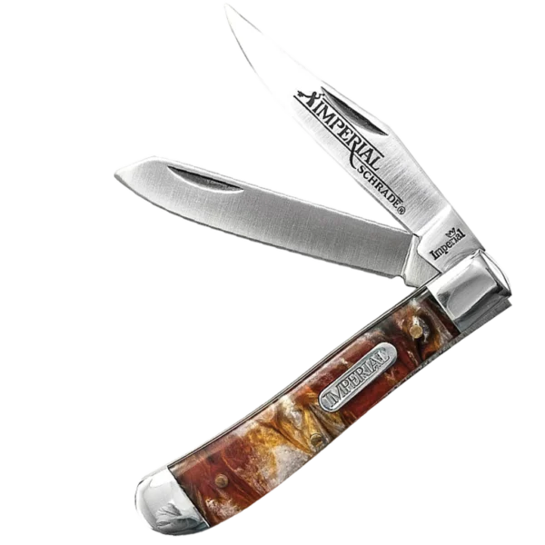 This handsome, traditional 2 blade pocket knife will quickly become your go-to tool. Made with durable 3C13MoV stainless steel blades, liners and bolsters, this knife is built to withstand years of the toughest tasks you can throw at it. The amber celluloid handles are as rugged as they are attractive. Two unique blades mean you'll have just the one you need at just the right time. Broader at one end and slightly curved, this pocket knife fits your hand well and gives you ease of use, too.