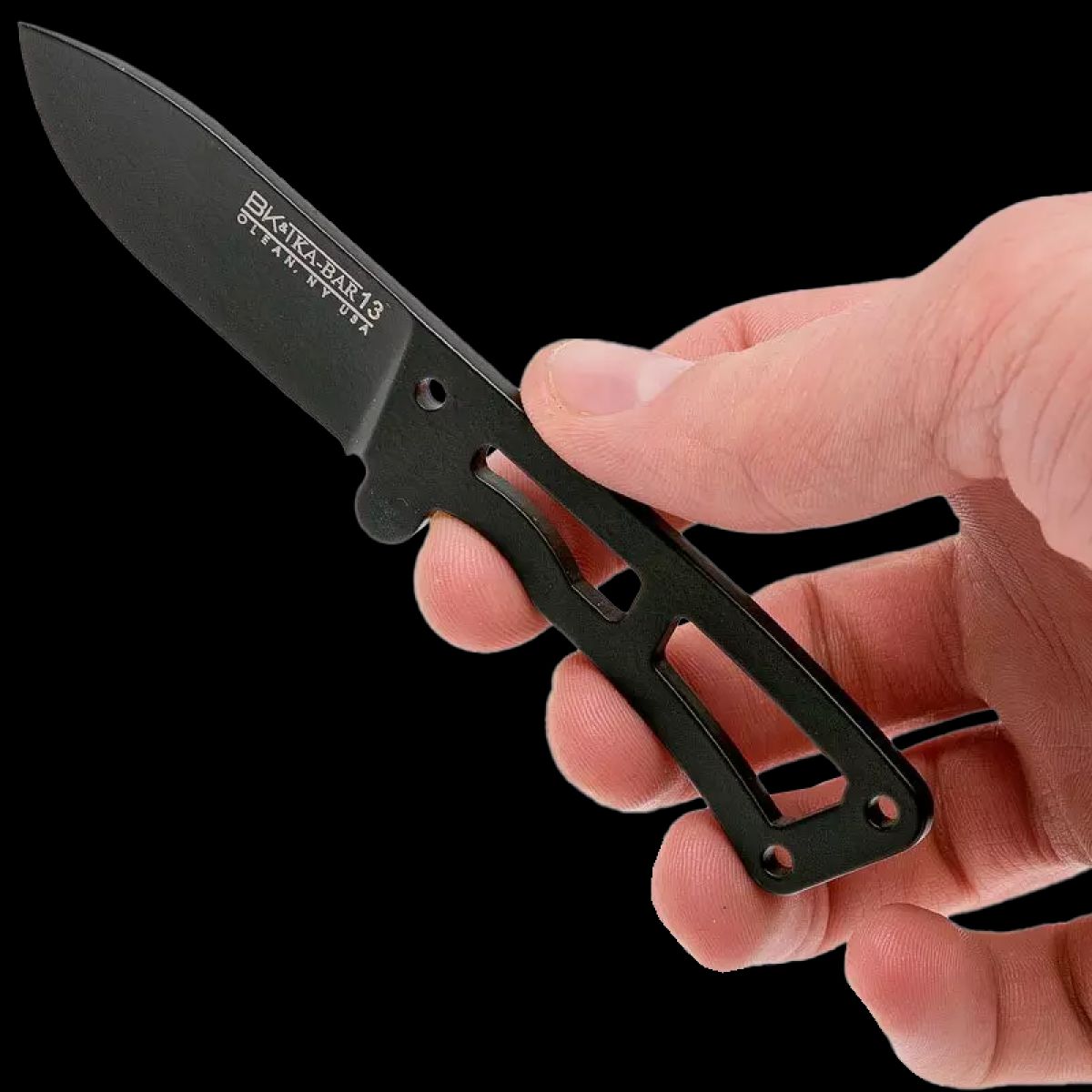The KA-BAR BK13CP neck knife is the result of a collaboration between knife designer Ethan Becker and KA-BAR. The knife is compact and very light in weight. The knife has a stone-washed finish and is made of 1095 Carbon Steel.