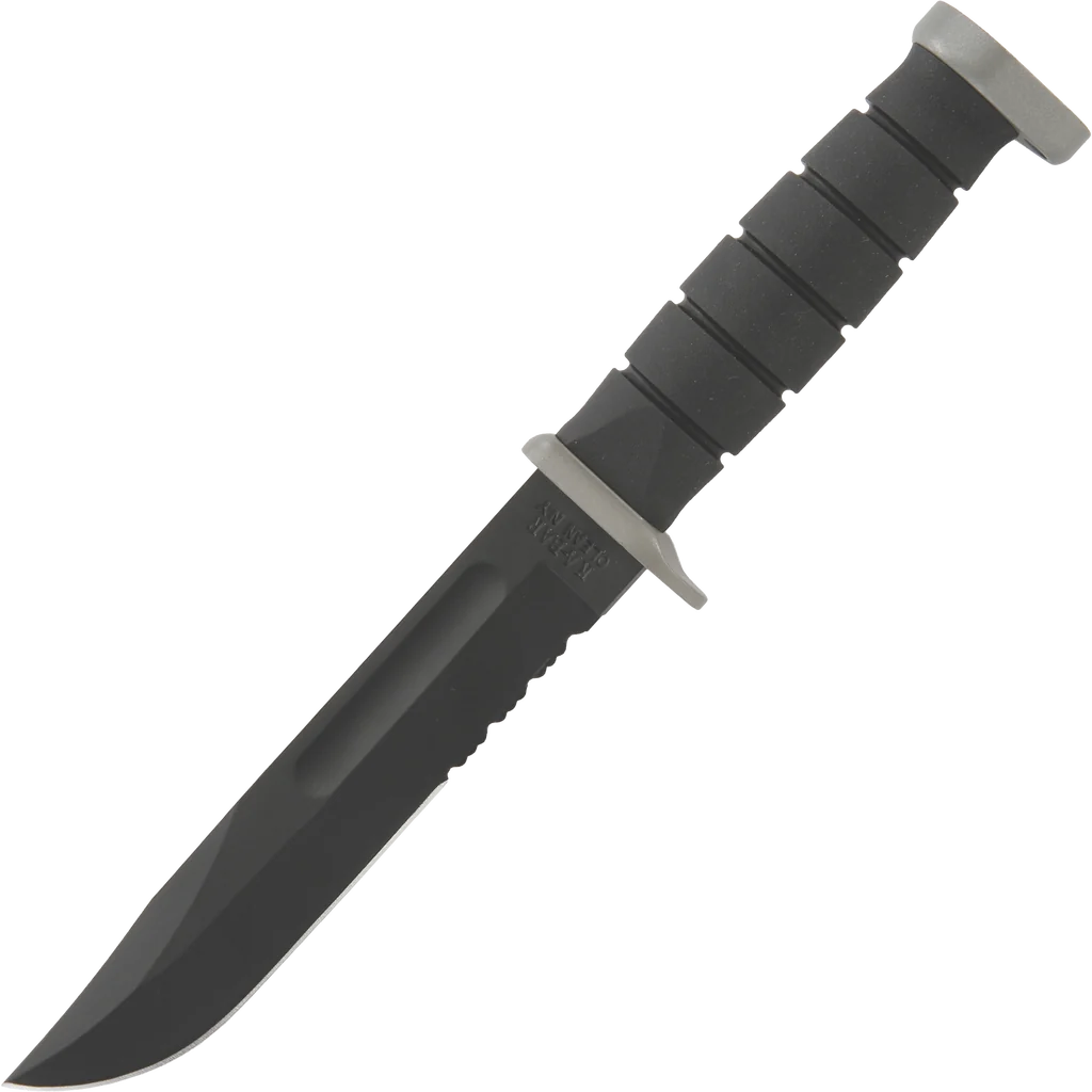 This lightweight knife features the D2 steel blade, one of the strongest and most durable materials used in knife making. It features a 20-degree blade angle and the classic clip-point blade shape that made Ka-Bar famous in the industry. The comfortable handle is made from Kraton G, providing a balanced grip, while the powdered metal butt cap is made to last. The flat blade is seven inches long and the overall length is 11-7/8 inches. The knife includes a glass-filled, nylon sheath to keep the blade safe and sharp. Made in the USA
