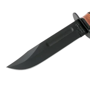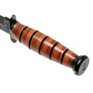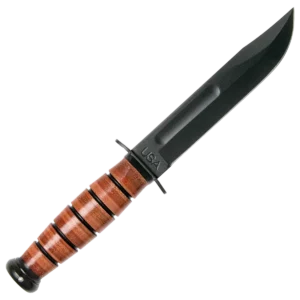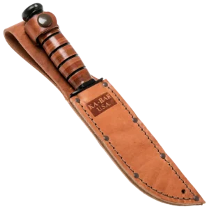 A more compact version of the traditional KA-BAR marked with KA-BAR U.S.A. This 3/4 size KA-BAR knife features a stacked and polished leather disc handle, a pinned butt cap and double guard that are both powdered metal coated to prevent corrosion. The full tang knife has a blade that is 5 1/4" in length, and has a total overall length of 9 1/4". Leather sheath included.