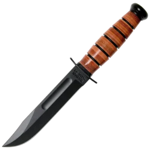 A more compact version of the traditional KA-BAR marked with KA-BAR U.S.A. This 3/4 size KA-BAR knife features a stacked and polished leather disc handle, a pinned butt cap and double guard that are both powdered metal coated to prevent corrosion. The full tang knife has a blade that is 5 1/4" in length, and has a total overall length of 9 1/4". Leather sheath included.