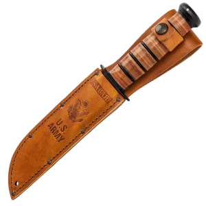 Since the 1940's, the Ka-Bar 7" Utility knife has been a trusted companion for Soldiers, Marines and Seamen alike. The Ka-Bar US Army OEF Utility knife honors veterans who served during Operation Enduring Freedom with this commemorative memorial knife. Featuring the iconic clip point blade, 1095 Cro-Van steel is painstakingly ground and heat treated to ensure each knife is tough and durable while remaining easy to sharpen to a hair popping edge and features gold decorative artwork. Stacked leather handles are bonded together and contoured into the familiar oval shape, comfortable in hand while providing excellent traction and control. The embossed US Army brown leather sheath adds to the aesthetic and reverent appeal of the knife.