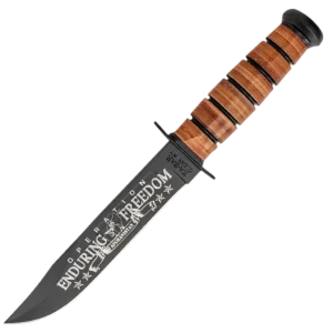 Since the 1940's, the Ka-Bar 7" Utility knife has been a trusted companion for Soldiers, Marines and Seamen alike. The Ka-Bar US Army OEF Utility knife honors veterans who served during Operation Enduring Freedom with this commemorative memorial knife. Featuring the iconic clip point blade, 1095 Cro-Van steel is painstakingly ground and heat treated to ensure each knife is tough and durable while remaining easy to sharpen to a hair popping edge and features gold decorative artwork. Stacked leather handles are bonded together and contoured into the familiar oval shape, comfortable in hand while providing excellent traction and control. The embossed US Army brown leather sheath adds to the aesthetic and reverent appeal of the knife.