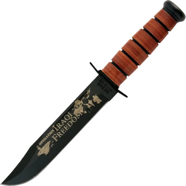 The KA-BAR 9127 features a 7" clip point blade made of 1095 Cro-Van high carbon steel, and U.S. Army tang stamp. The blade has a black finish, a fuller and a laser engraved Operation Iraqi Freedom logo. The stacked leather washer handle has a powdered metal butt cap and a carbon steel guard. The butt cap and the guard are both epoxy powder coated. The KA-BAR US Army Iraqi Freedom Knife has an overall length of 11 7/8", and weighs 11.2 ounces. Made in the USA.
