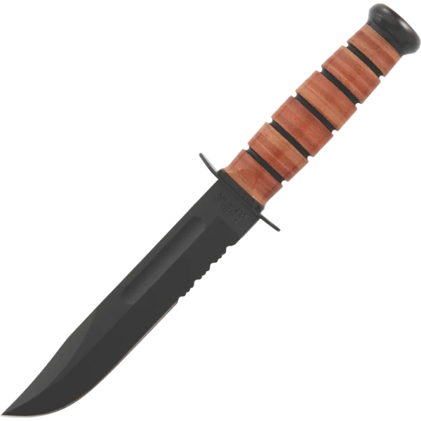 The traditional KA-BAR marked for Army personnel and featuring a partially serrated edge to aid in cutting synthetic and looped materials. Featuring the iconic clip point blade, 1095 Cro-Van steel is painstakingly ground and heat treated to ensure each knife is tough and durable. Stacked leather handles are bonded together and contoured into the familiar oval shape, comfortable in hand while providing excellent traction and control. Tang stamped U.S. ARMY. Leather sheath included.