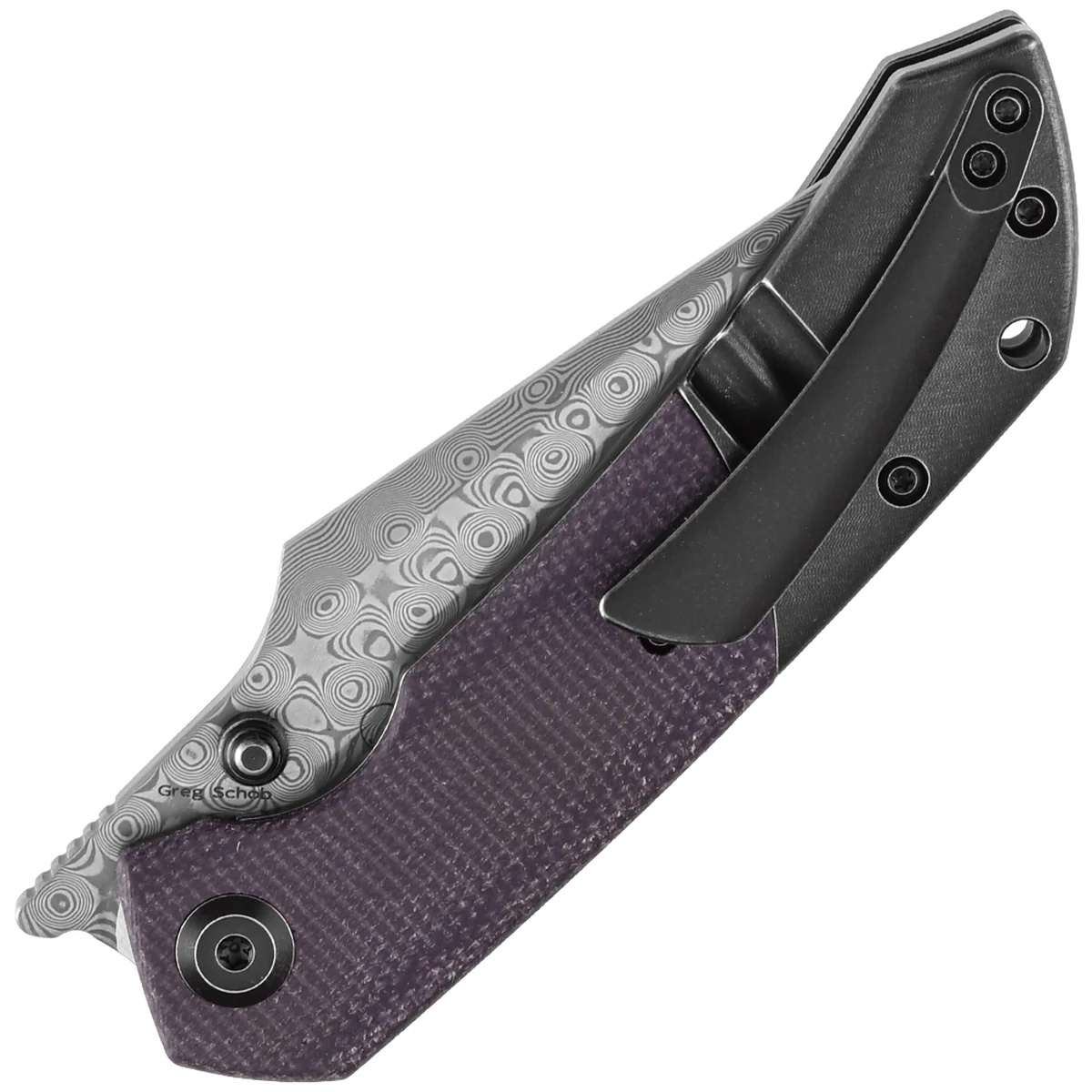 Fenrir is a functional EDC knife with bold aesthetic lines.The large belly and sharp point make it versatile for every day use, whether in urban or outdoor environments. Multiple deployment options and versatile ergonomics make it a great knife to handle. The Fenrir is crafted with high-quality materials like Damascus steel for the blade, renowned for its edge retention and corrosion resistance, along with a combination of micarta and titanium for the handle, ensuring durability and lightweight performance and giving it a sleek and stylish appearance. Designed by Greg Schob, the Fenrir knife is engineered with user comfort in mind, with an ergonomic handle design that fits naturally in the hand, reducing fatigue during extended use.