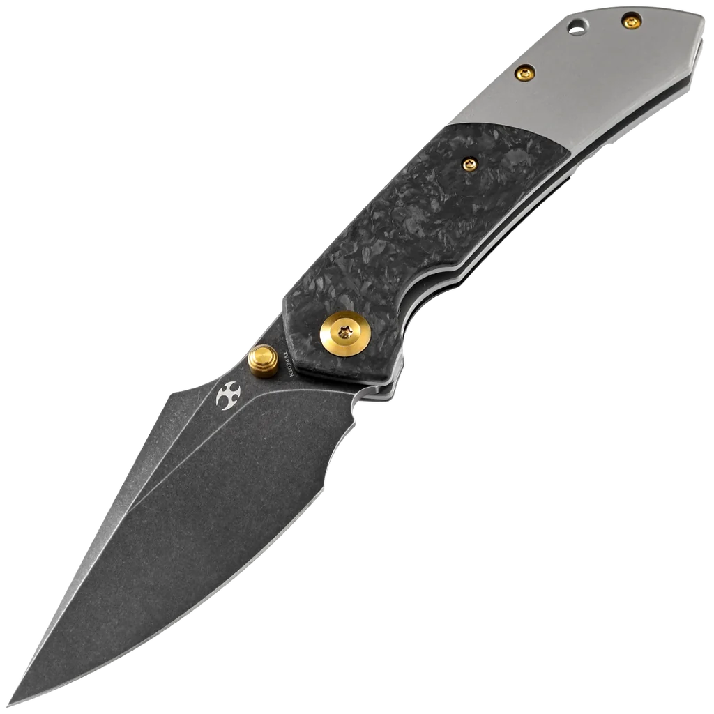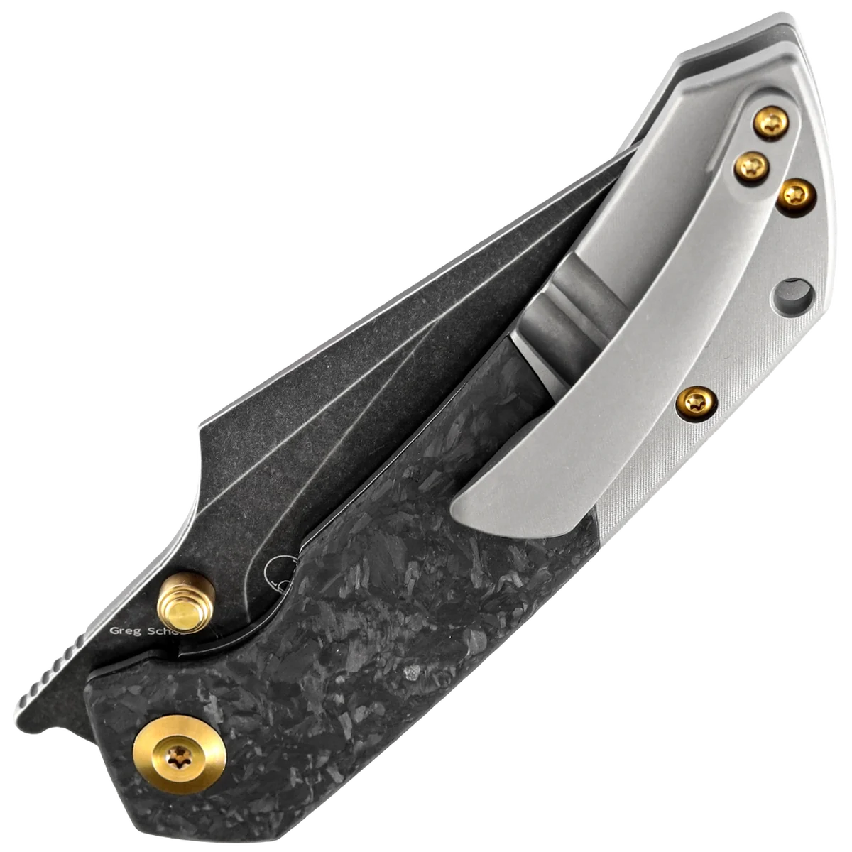 Fenrir is a functional EDC knife with bold aesthetic lines.The large belly and sharp point make it versatile for every day use, whether in urban or outdoor environments. Multiple deployment options and versatile ergonomics make it a great knife to handle. The Fenrir is crafted with high-quality materials like CPM-S35VN steel for the blade, renowned for its edge retention and corrosion resistance, along with a combination of shred carbon fiber and titanium for the handle, ensuring durability and lightweight performance and giving it a sleek and stylish appearance. Designed by Greg Schob, the Fenrir knife is engineered with user comfort in mind, with an ergonomic handle design that fits naturally in the hand, reducing fatigue during extended use.