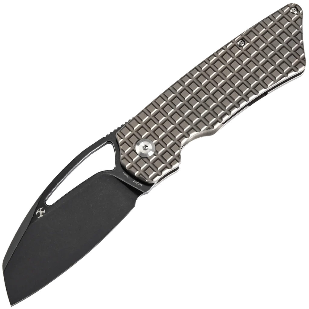 Introducing the Kansept Goblin XL folding knife, a masterpiece designed by Marshall Noble of Noble Knives. Drawing inspiration from the compact yet powerful 1984 US Airforce XF-85 Goblin experimental jet, this knife embodies a perfect blend of form and function. Its robust 3.5" CPM-S35VN stainless steel blade features a sheepsfoot style blade with a durable black stonewashed finish, ensuring durability and precision in every cut. The handle is crafted from bronze anodized titanium with a tactile frag pattern, providing a unique aesthetic appeal and an extremely secure grip. Complete with a stylish milled titanium pocket clip designed for tip-up, right-side carry, the Kansept Goblin XL is the ultimate choice for knife enthusiasts seeking both functionality and artistic design in their everyday carry essentials.