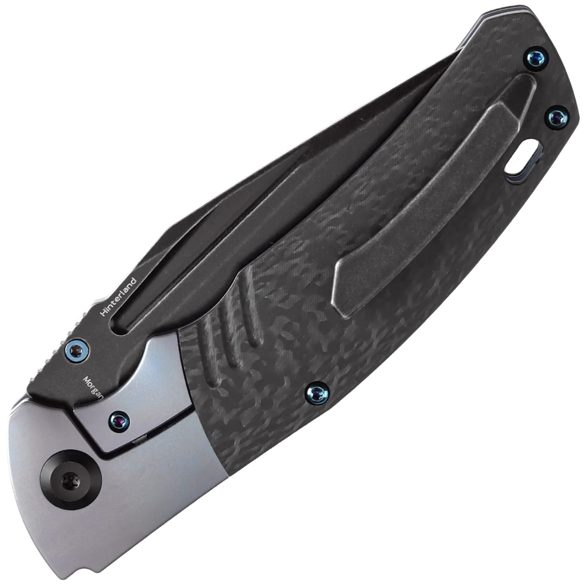 The Hinterland folding knife by Morgan Koens represents a seamless fusion of utility and elegance. With a background steeped in custom fixed blade craftsmanship, Koens has translated his expertise into the realm of folding knives, delivering a design that merges the classic Bowie shape with modern functionality. Featuring a thumb stud for smooth deployment, a long clip point for efficient piercing, and an ergonomic handle designed for everyday comfort, the Hinterland is aptly named for navigating the unknown and tackling any challenge. Equipped with a strong frame lock design, the blade is kept safely in place during use, preventing accidental closure. At the same time, the stud design on the blade makes the unlocking method diversified. The handle’s textured diagonal grooves increase friction for a secure hold, preventing slips during use
