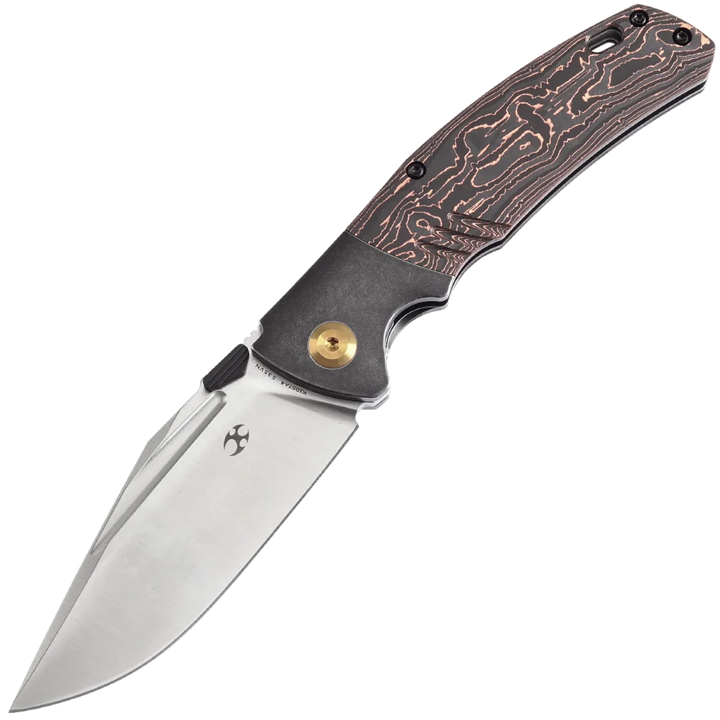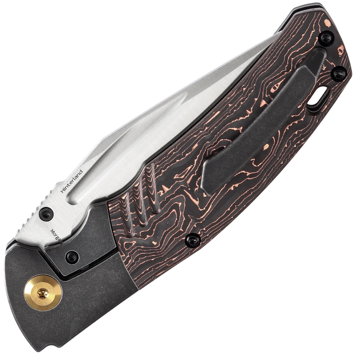 The Hinterland folding knife by Morgan Koens represents a seamless fusion of utility and elegance. With a background steeped in custom fixed blade craftsmanship, Koens has translated his expertise into the realm of folding knives, delivering a design that merges the classic Bowie shape with modern functionality. Featuring a thumb stud for smooth deployment, a long clip point for efficient piercing, and an ergonomic handle designed for everyday comfort, the Hinterland is aptly named for navigating the unknown and tackling any challenge. Equipped with a strong frame lock design, the blade is kept safely in place during use, preventing accidental closure. At the same time, the stud design on the blade makes the unlocking method diversified. The handle’s textured diagonal grooves increase friction for a secure hold, preventing slips during use