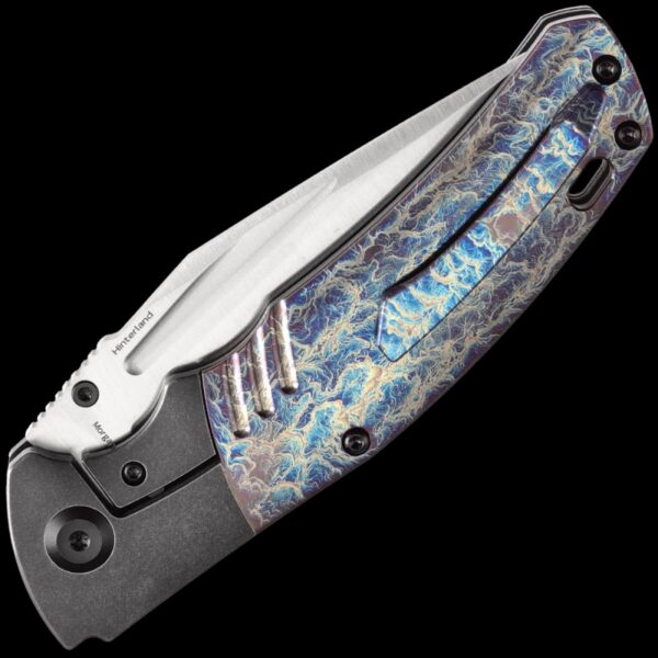 The Hinterland folding knife by Morgan Koens represents a seamless fusion of utility and elegance. With a background steeped in custom fixed blade craftsmanship, Koens has translated his expertise into the realm of folding knives, delivering a design that merges the classic Bowie shape with modern functionality. Featuring a thumb stud for smooth deployment, a long clip point for efficient piercing, and an ergonomic handle designed for everyday comfort, the Hinterland is aptly named for navigating the unknown and tackling any challenge. Equipped with a strong frame lock design, the blade is kept safely in place during use, preventing accidental closure. At the same time, the stud design on the blade makes the unlocking method diversified. The handle’s textured diagonal grooves increase friction for a secure hold, preventing slips during use