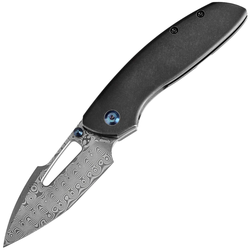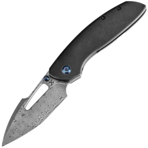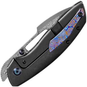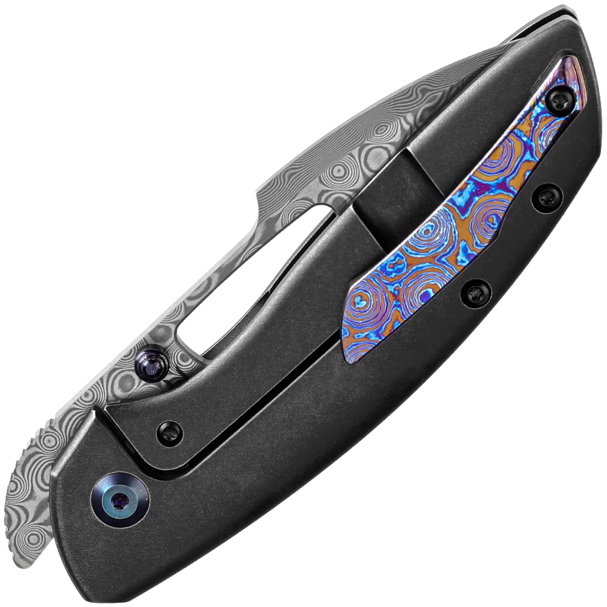 The Link was designed to have a sharp sleek look while retaining the key features of an EDC blade: excellent ergonomics and fantastic fidgetability. Ergonomics are provided by the neutral handle shape and forward choil, while fidget factor comes from the prominent front-flipper combined with the broad opening hole and thumbstud. Enhanced by ceramic ball bearings, these features ensure a butter-smooth and enjoyable opening and closing action for the user. The compound grind and subtly tanto-shaped harpoon blade offer practical utility with a keen point and thin edge. This model features a 3" Damascus blade and sleek black titanium handles, with a Timascus pocket clip.