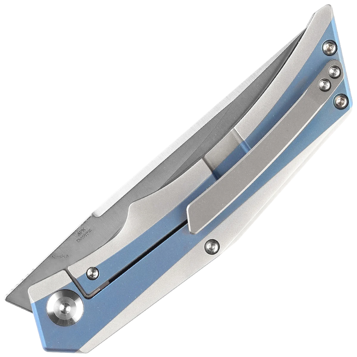 Designer of the Naska, Aurelien, wanted a functional folding knife, a knife that can be taken into any pocket to perform simple tasks as well as more demanding tasks while trying to have a contemporary design that differs from what can usually be seen. He wanted a knife with a shape that allows great versatility in adapting blade shapes, a knife on which you can mount a tanto blade as well as a drop point blade, while respecting the original contemporary spirit of the knife