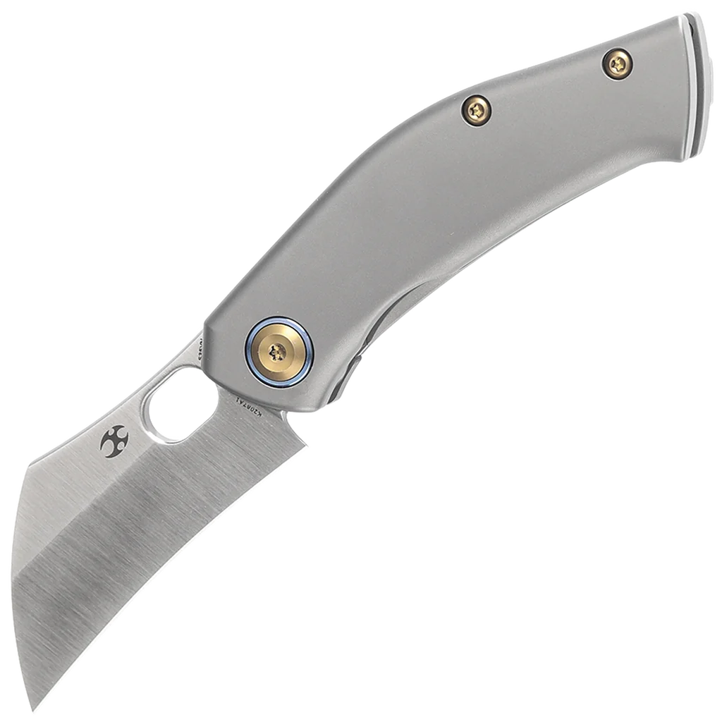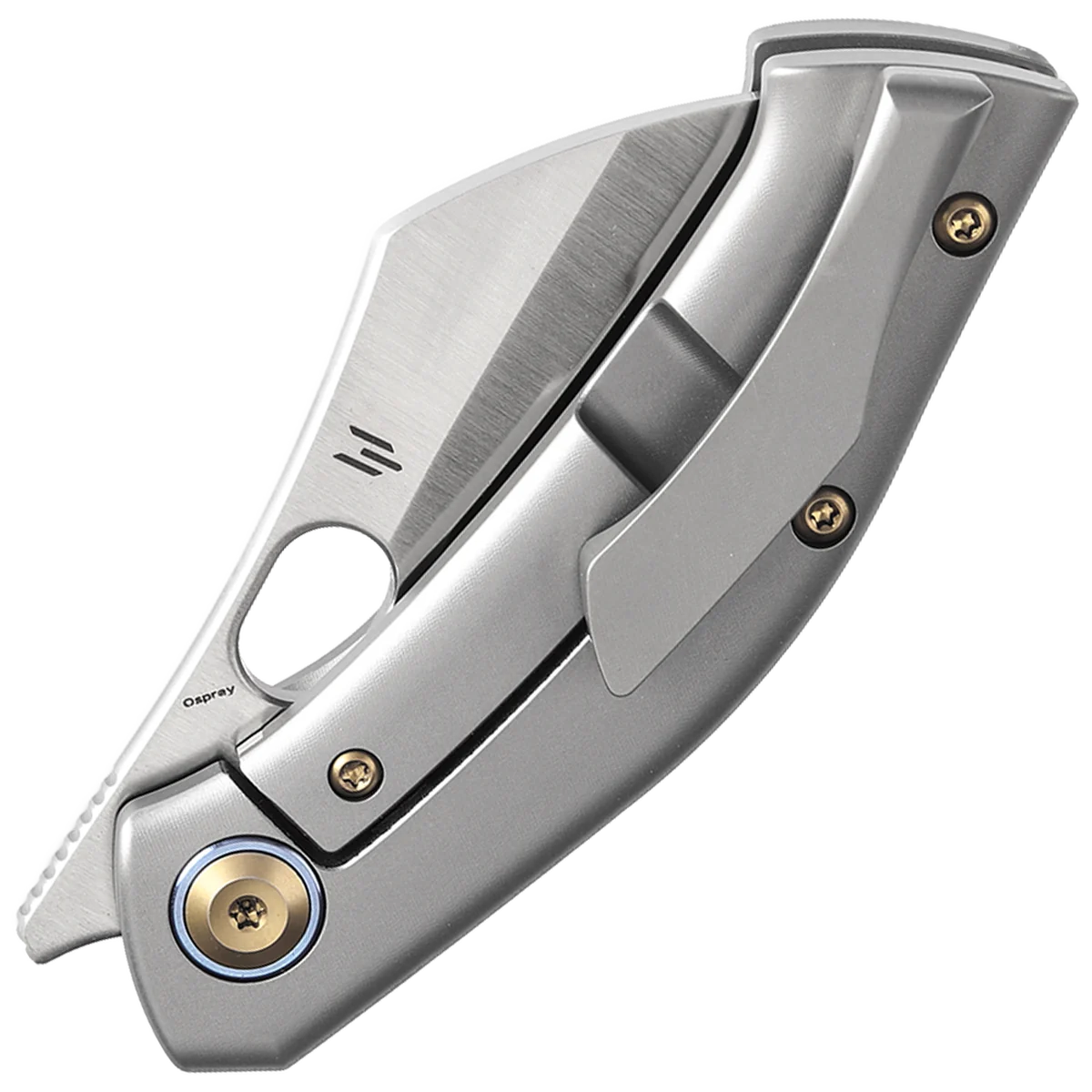 The Osprey features a distinctive recurved hawksbill blade crafted from premium CPM S35VN steel, offering superior performance and edge retention. Its unique shape ensures precise slicing and excellent control, making it ideal for various tasks. With its durable materials, the Osprey delivers both functionality and style in a compact package. The folder boasts a lightweight full titanium handle with internal milling slots that reduce weight without sacrificing strength. Its Frame Lock mechanism ensures a secure blade lock, providing confidence and reliability during use. The Osprey is designed for comfort, featuring smooth, flowing lines that fit perfectly in the hand. Despite its compact size, the handle contours to the palm, with all edges rounded and a crowned spine on the blade for a secure, comfortable grip.